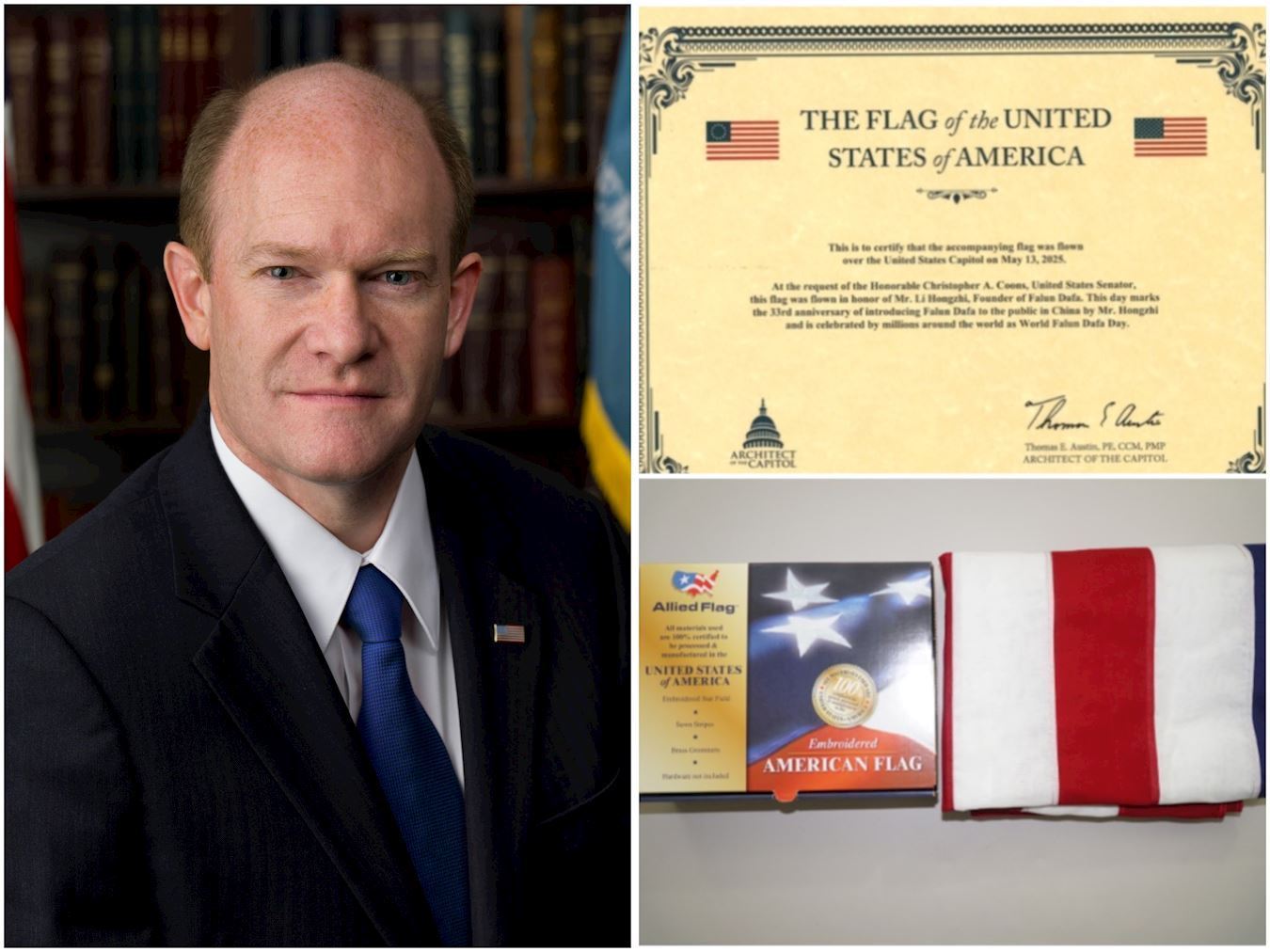 Senator Coons je gospodinu Liju uručio nacionalnu zastavu koja se vijorila iznad Kapitola i izdao sertifikat. Na sertifikatu piše: „Ovim se potvrđuje da se zastava u prilogu vijorila iznad Kapitola Sjedinjenih Američkih Država 13. maja 2025. godine. Na zahtjev uvaženog Christophera A. Coonsa, senatora Sjedinjenih Američkih Država, ova zastava se vijorila u čast gospodina Li Hongzhija, osnivača Falun Dafa. Ovog se dana obilježava 33. godišnjicu predstavljanja Falun Dafa javnosti u Kini od strane gospodina Hongzhija i milioni ljudi širom svijeta slave ovaj dan kao Svjetski Falun Dafa dan.“