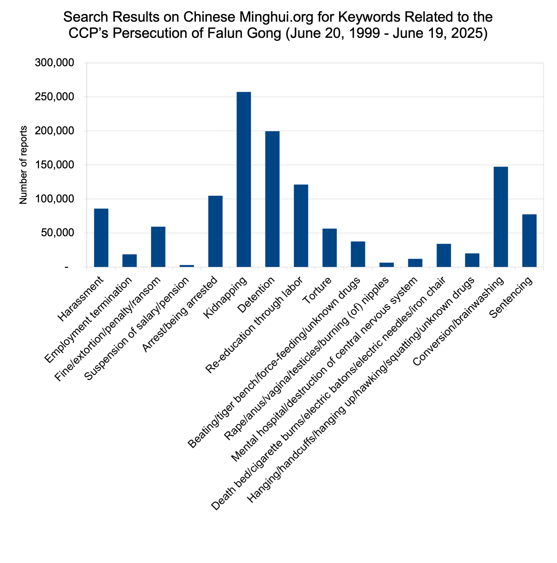 Kao rezultat kontinuiranih zločina i laži KPK, mnogi praktikanti su bili maltretirani, hapšeni i mučeni. Kako bi čitaocima pružili sažet uvid u progon, nedavno su izvršena pretraživanja uz pomoć ključnih riječi za period između 20. juna 1999. i 19. juna 2025. godine, navedenih u nastavku na kineskoj verziji Minghui.org (koja ima potpuniju pokrivenost od verzija na drugim jezicima).