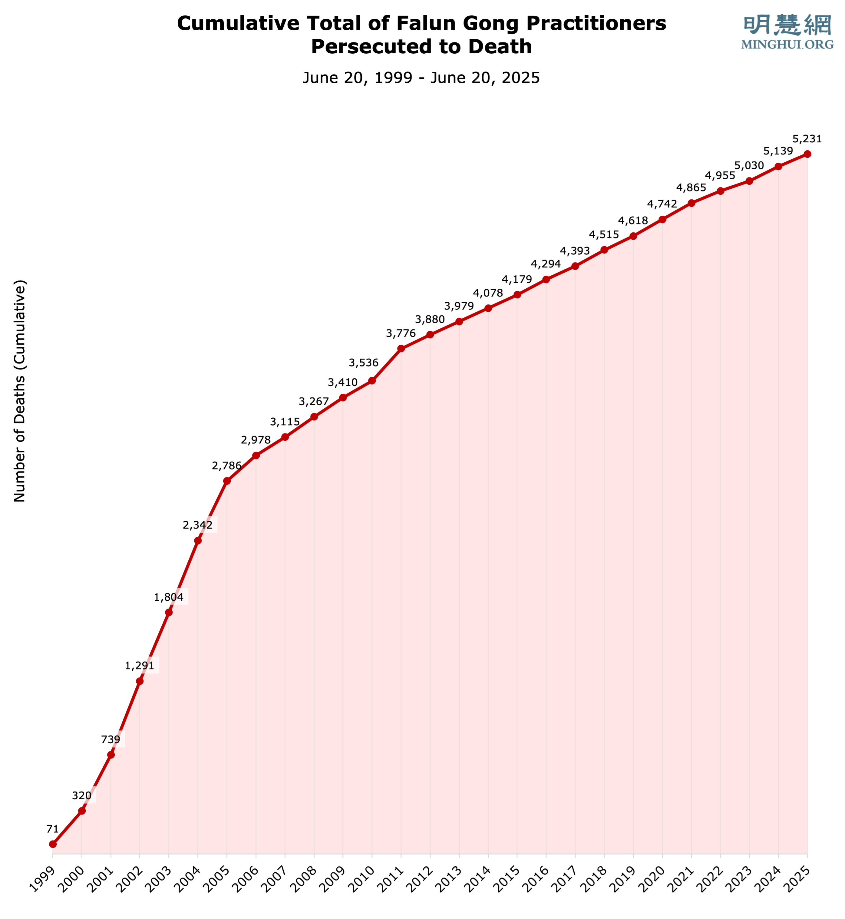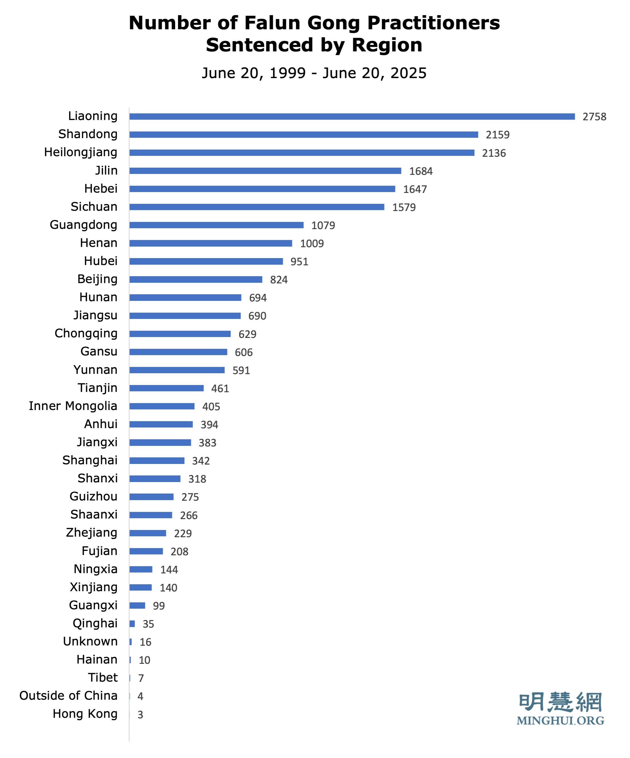 Podaci od 2017. do 2025. preuzeti su iz statističkih izvješća na Minghui.org. Postoje razlike u podacima za 2017.-2023. između ovih izvješća i 25-godišnjeg Minghui izvješća. To je možda doprinijelo nedosljednostima između raščlanjivanja po godinama i regijama.