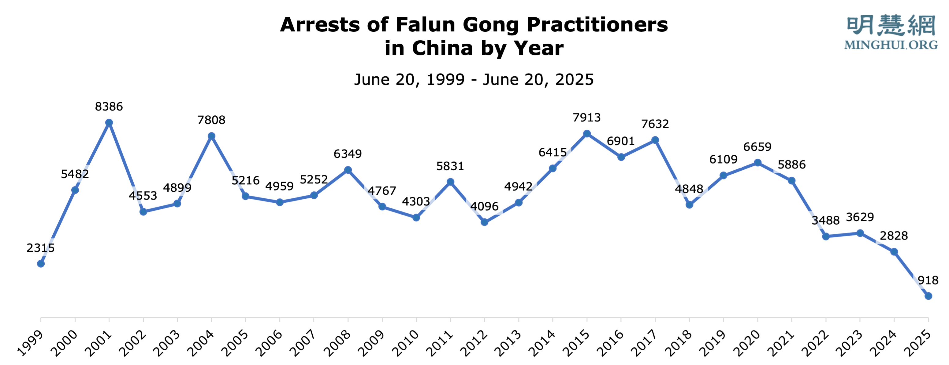 Ovaj članak pruža grupu statističkih podataka o progonu Falun Dafa koje je prikupio Minghui.org između 20. lipnja 1999. i 20. lipnja 2025. Ove brojke omogućuju uvid u cjelokupnu situaciju progona, sposobnost i naporan rad praktikanata u Kini u prikupljanju i prenošenju informacija, kao i rezultate neumornog truda svih praktikanata u suzbijanju progona tijekom proteklih 26 godina. Iz slika 3, 5, 7 i 9 vidimo trend koji ukazuje na to da se progon bliži kraju.