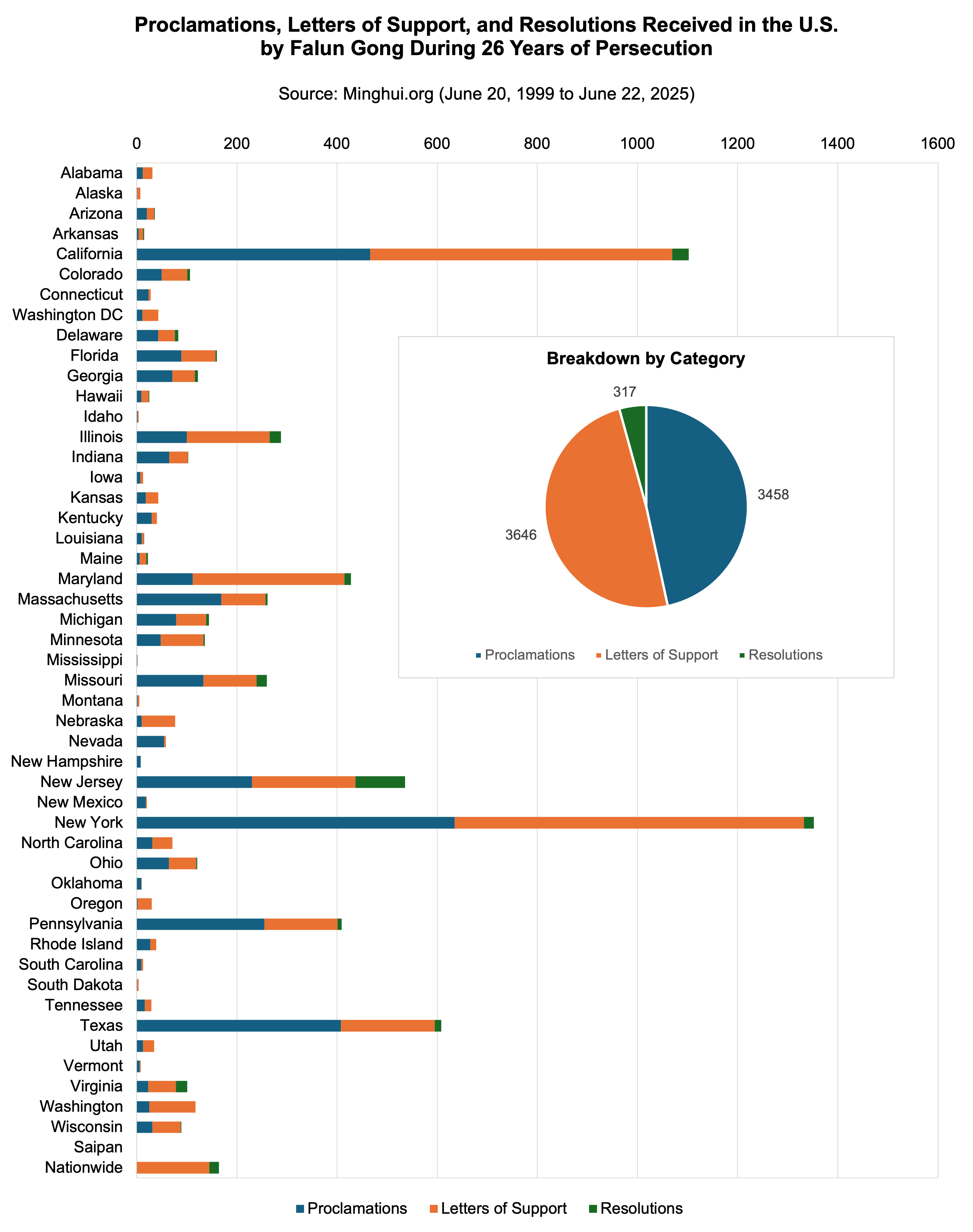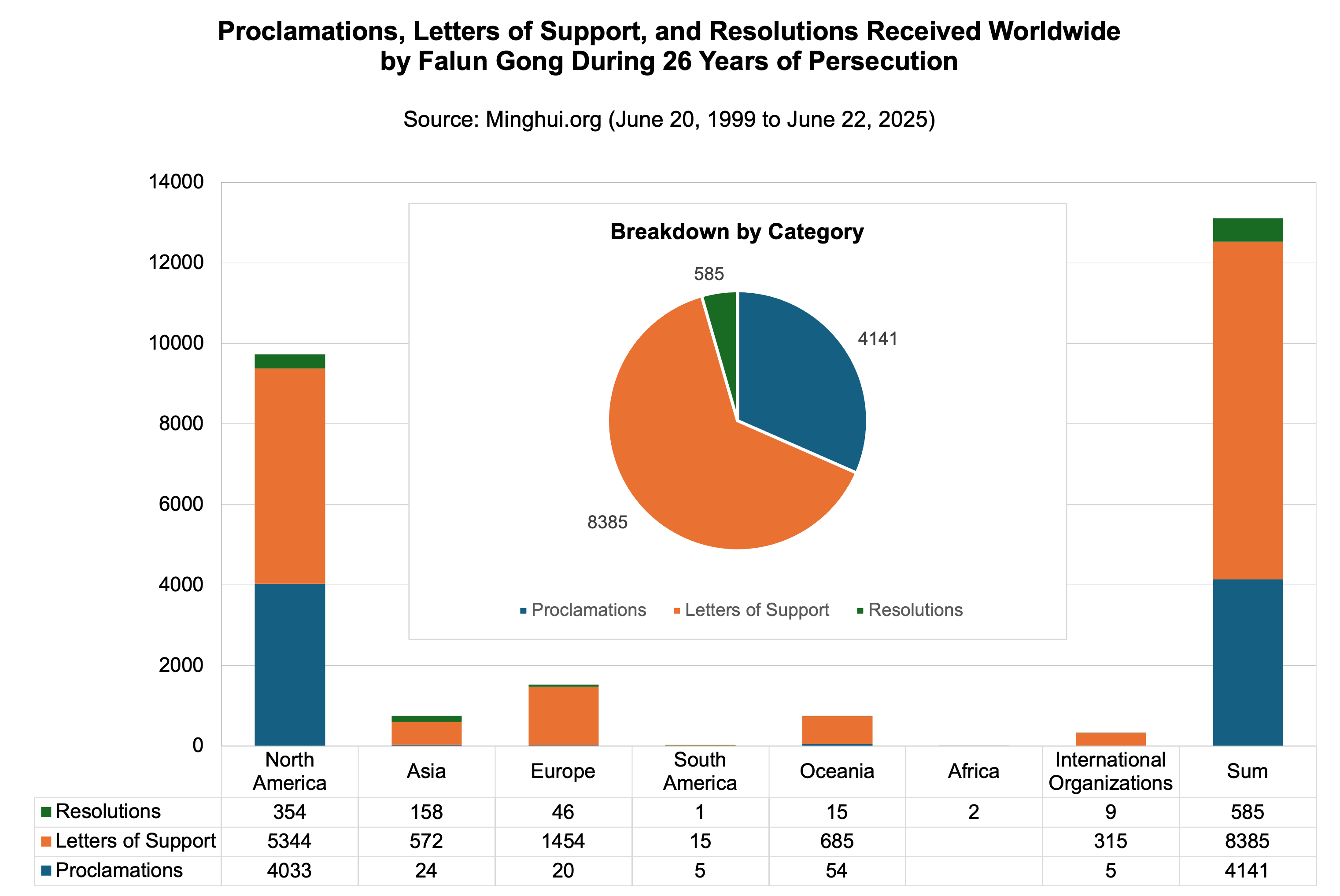 Prema statistici Minghuija, Falun Gong je tokom proteklih 26 godina progona primio oko 13.000 priznanja, pisama podrške i rezolucija širom sveta. Među njima, preko 7.400 (ili oko 57%) potiče od izabranih zvaničnika na saveznom i državnom nivou u Sjedinjenim Državama. Ispod su sumirani podaci iz SAD i celog sveta.
