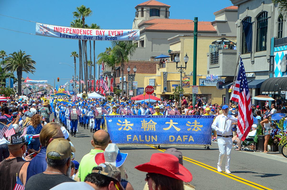 Da bi proslavio 249. Dan nezavisnosti zemlje, Hantington Bič je održao svoju 121. paradu povodom 4. jula. Praktikanti Falun Dafe činili su najveću grupu na paradi. Predvođena Marširajućim orkestrom Tjen Guo, njihova formacija je uključivala platformu ukrašenu crvenom, belom i plavom bojom, sa praktikantkinjom obučenom kao nebeska devica, praćenu kontingentom praktikanata koji su demonstrirali vežbe.