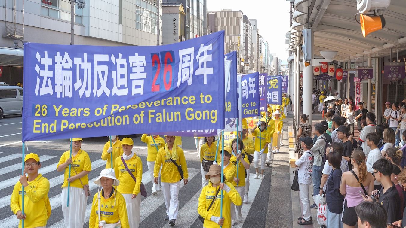 Praktikanti Falun Dafa održali su marš u gradu Kyotu 12. srpnja 2025. kako bi obilježili godišnjicu svog mirnog prosvjeda protiv progona koji sprovodi Komunistička partija Kine (KPK) od 20. srpnja 1999., i kako bi pozvali na njegov prekid.