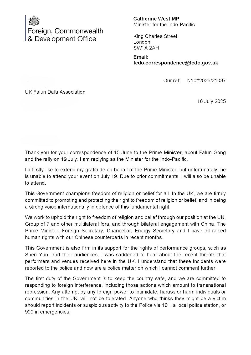 Uoči 26. godišnjice suprotstavljanja progonu Falun Dafe, 16. jula 2025, Falun Dafa asocijacija u UK primila je pismo od poslanice Ketrin Vest, ministarke za indo-pacifičke poslove u britanskom Forin ofisu, poslato u ime premijera, u kojem se izražava čvrsta podrška britanske vlade uverenjma Falun Gonga i nastupima plesne trupe Shen Yun.