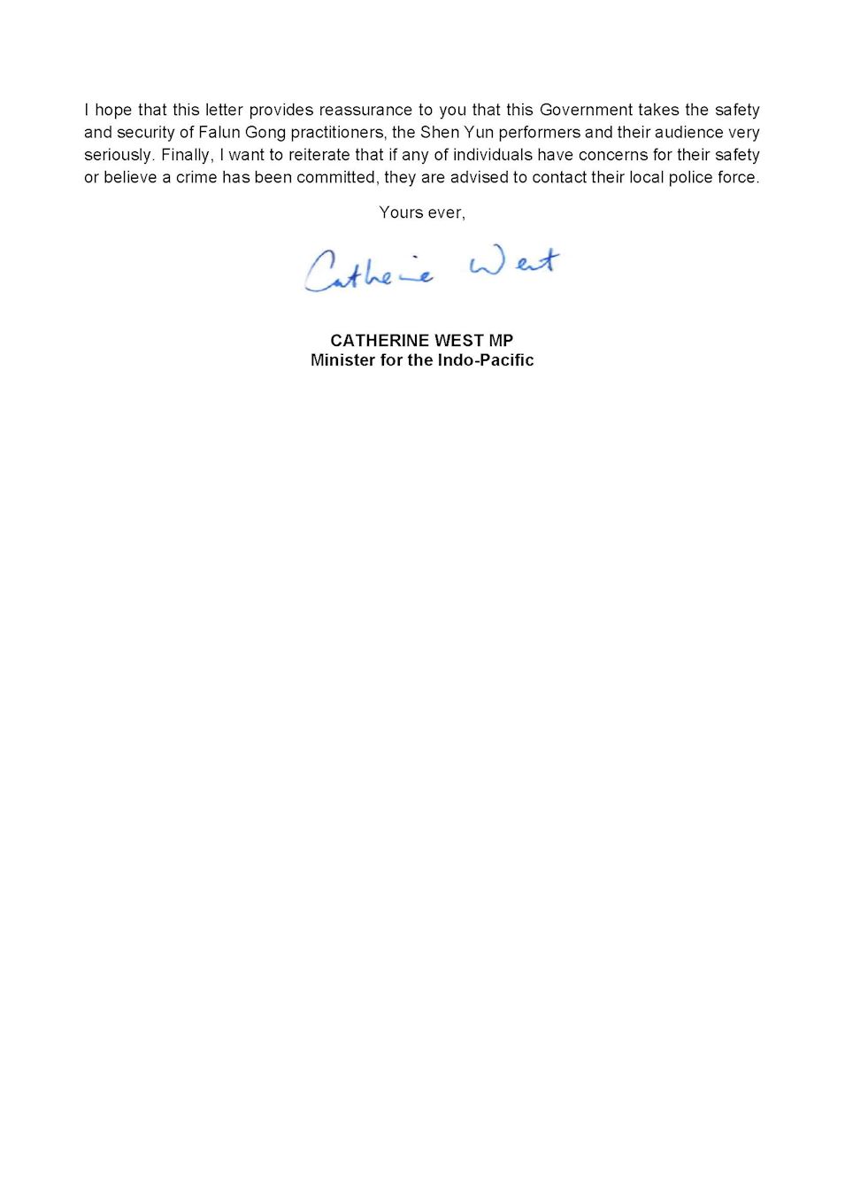 U svom završnom pasusu, Vest je napisala: „Nadam se da vam ovo pismo pruža uverenje da ova Vlada veoma ozbiljno shvata bezbednost praktikanata Falun Gonga, izvođača Shen Yun-a i njihove publike.“