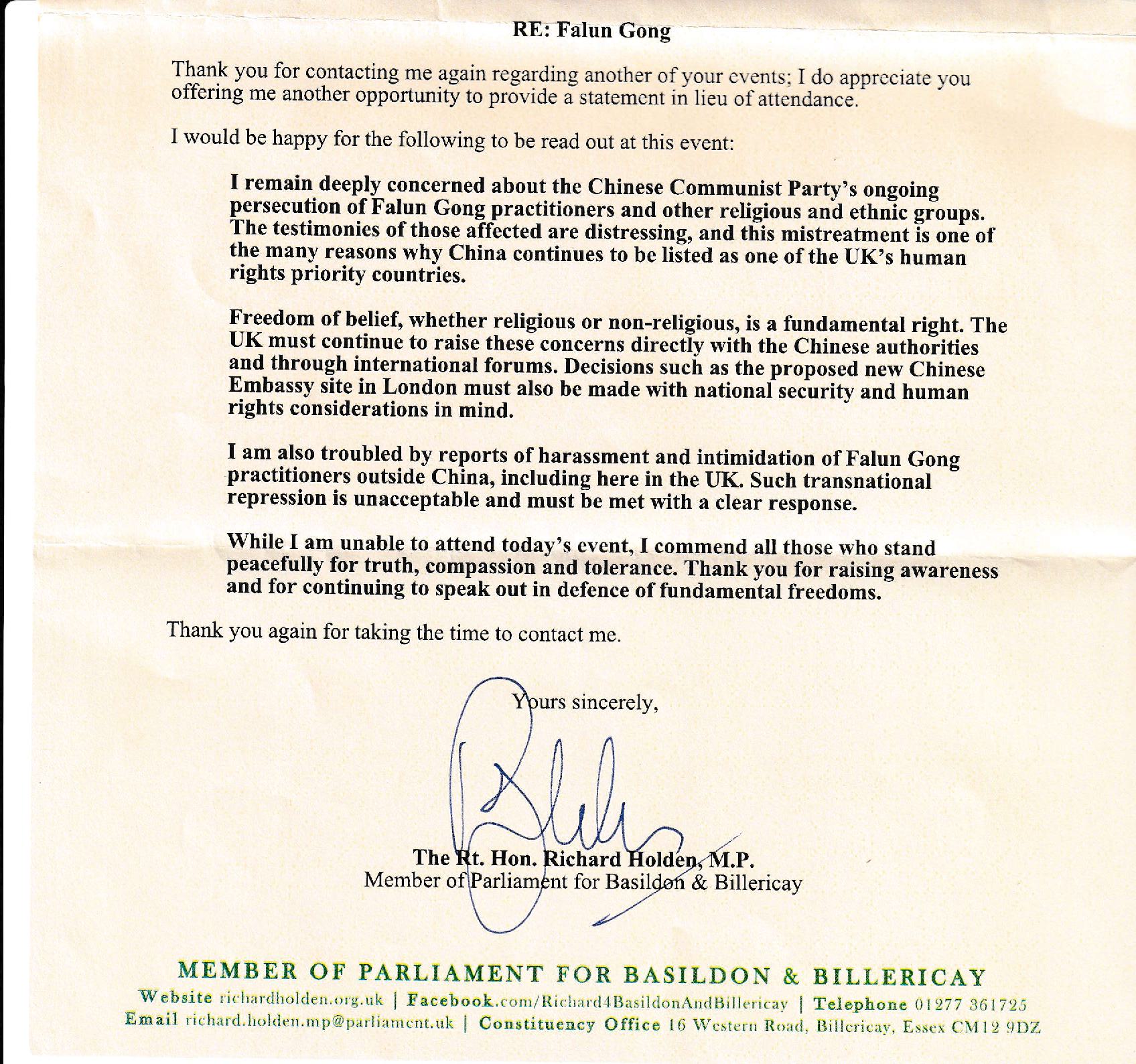 Fojsol Čoudhuri, MBE, poslanik škotskog parlamenta, ministar u senci za kulturu, Evropu i međunarodni razvoj za škotski parlament, naveo je u svom pismu: „Hvala vam na vašem imejlu u vezi sa tekućim progonom praktikanata Falun Gonga – pitanjem koje me i dalje zabrinjava.