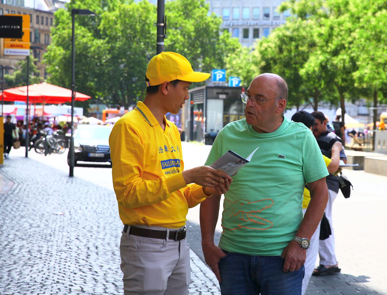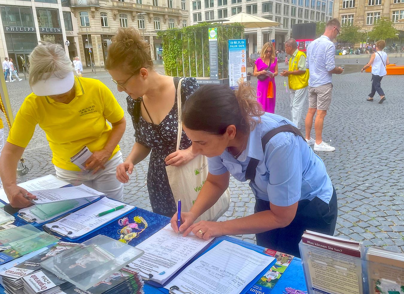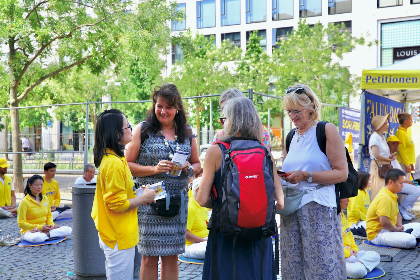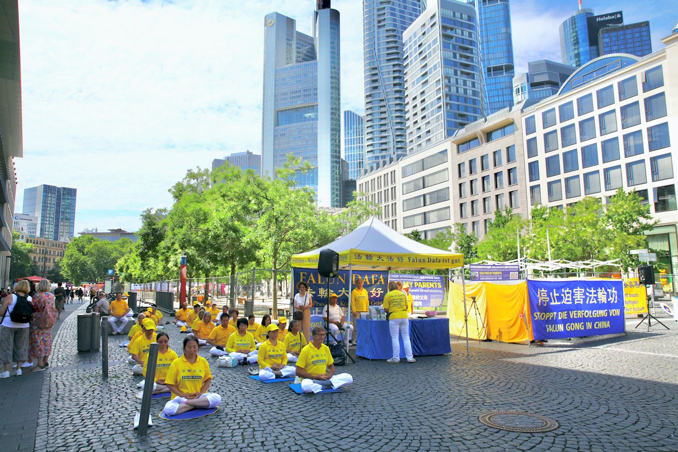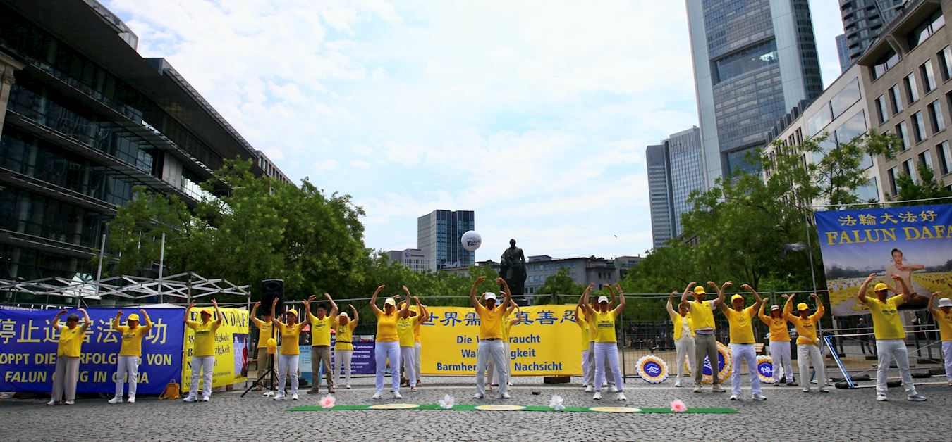 Praktikanti Falun Gonga iz Frankfurta i okolnih područja privukli su pažnju prolaznika na Geteplacu u centru grada. Neki su zastali da gledaju demonstraciju vežbi praktikanata, dok su drugi slušali govore na skupu ili razgovarali sa praktikantima. Želeli su da saznaju šta je Falun Gong, zašto ga KPK progoni i kako da pomognu praktikantima da okončaju progon. Neki ljudi su potpisali peticiju kojom se poziva na okončanje progona.