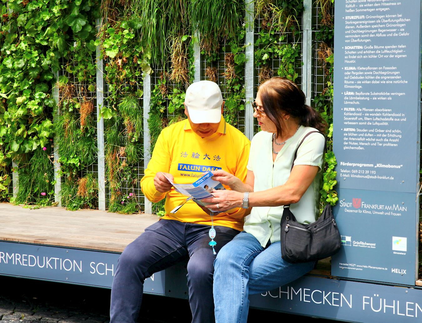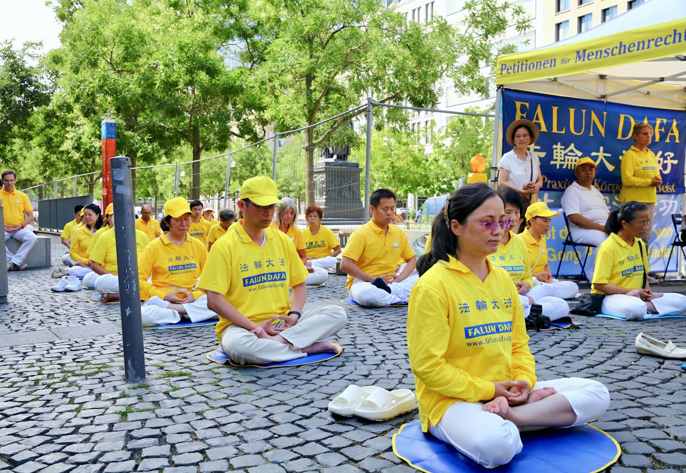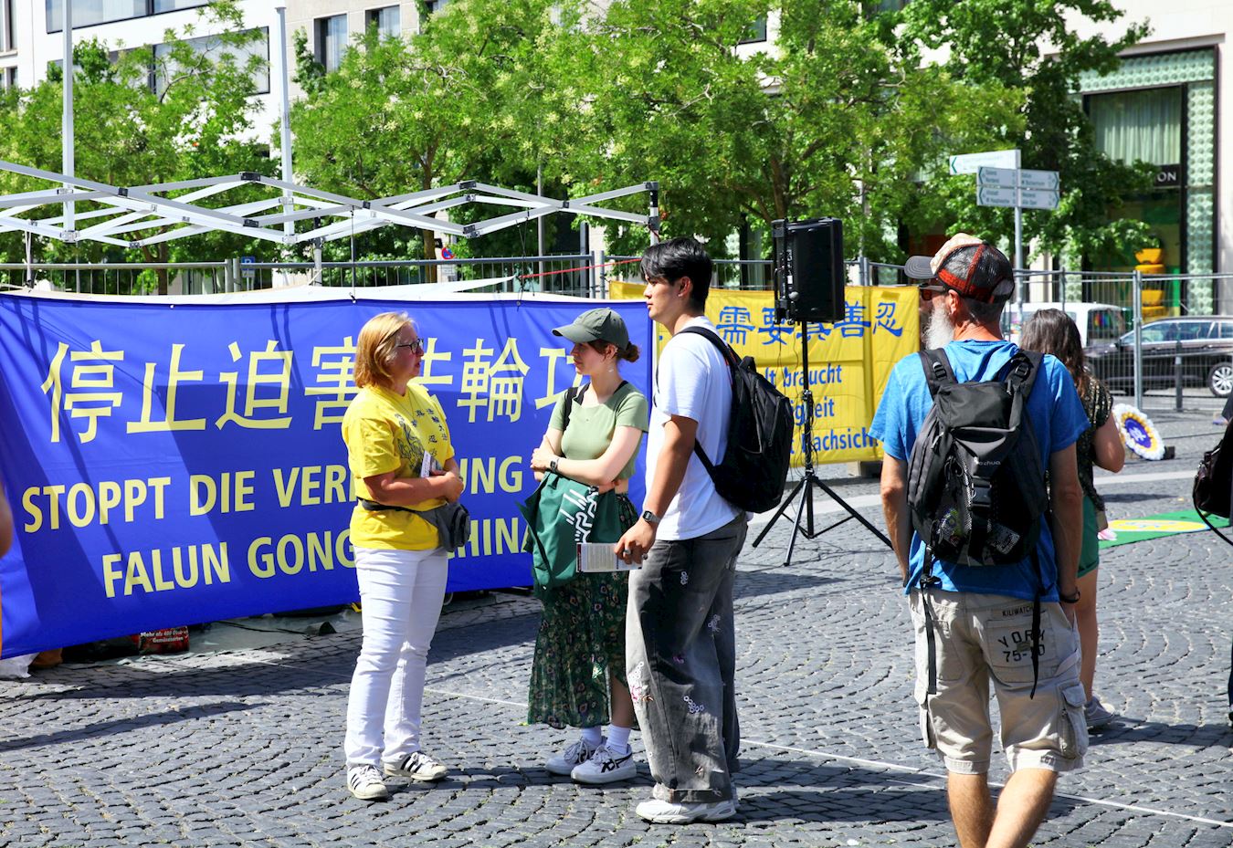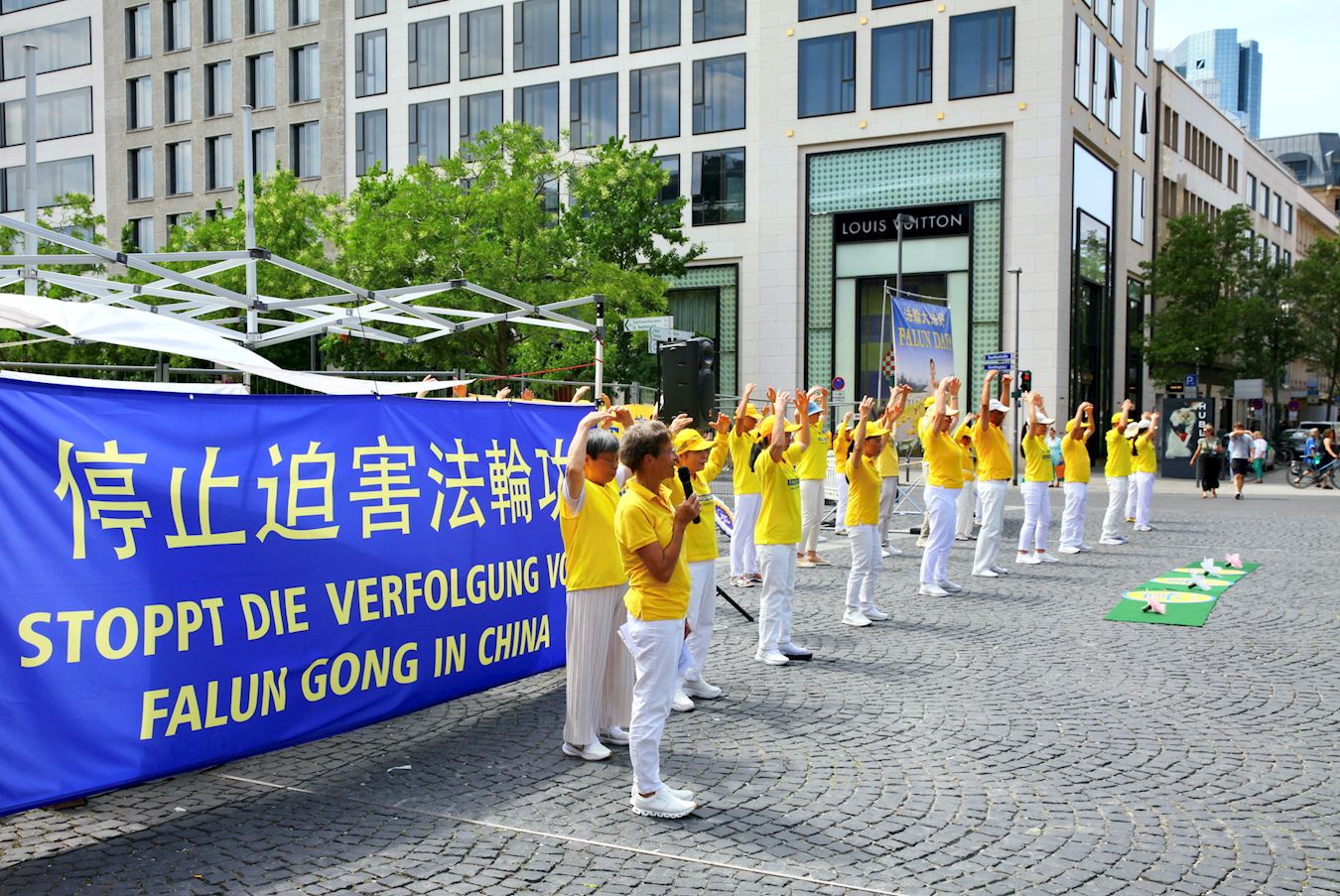 Praktikanti Falun Gonga iz Frankfurta i okolnih područja privukli su pažnju prolaznika na Geteplacu u centru grada. Neki su zastali da gledaju demonstraciju vežbi praktikanata, dok su drugi slušali govore na skupu ili razgovarali sa praktikantima. Želeli su da saznaju šta je Falun Gong, zašto ga KPK progoni i kako da pomognu praktikantima da okončaju progon. Neki ljudi su potpisali peticiju kojom se poziva na okončanje progona.