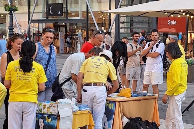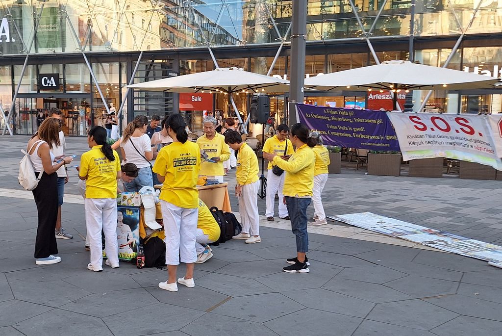 Mađarski praktikanti su u subotu, 19. srpnja 2025., održali skup na trgu Vörösmarty u središtu Budimpešte, kako bi mirno prosvjedovali protiv 26-godišnjeg progona Falun Gonga koji vrši Komunistička partija Kine (KPK).