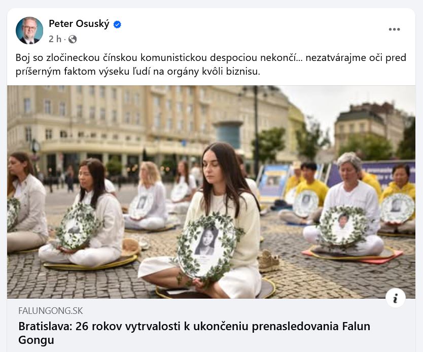 Gospodin Osusky je također 20. srpnja na svom profilu na društvenim mrežama podijelio članak o ovom događaju, uz komentar: „Borba protiv zločinačkog kineskog komunističkog despotizma nije gotova... nemojmo zatvarati oči pred sramotnom činjenicom koja se zove prisilna žetva organa od ljudi za novac.”
