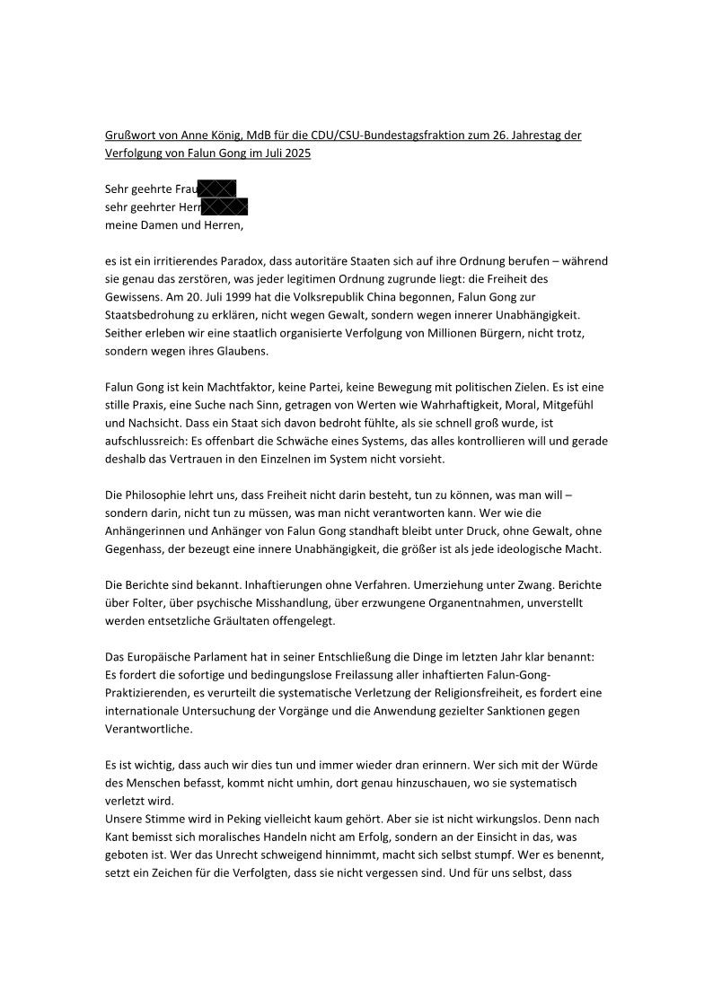 Savezna poslanica Ane Kenig je u svom pismu navela: „Uznemirujući je paradoks da se autoritarne države pozivaju na svoj poredak – dok uništavaju upravo ono što je u osnovi svakog legitimnog poretka: slobodu savesti. 20. jula 1999. Narodna Republika Kina je počela da proglašava Falun Gong pretnjom po državu, ne zbog nasilja, već zbog njegove unutrašnje nezavisnosti. Od tada smo svedoci državno organizovanog progona miliona građana, ne uprkos, već zbog njihove vere.“
