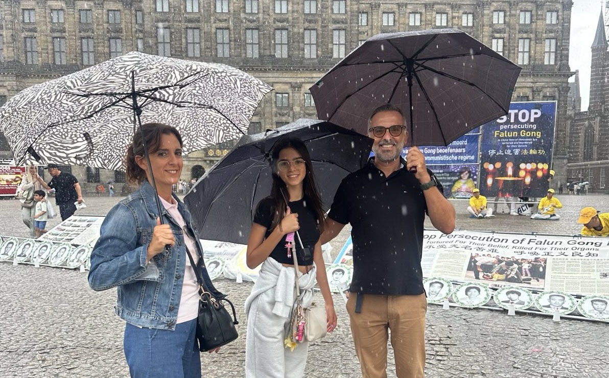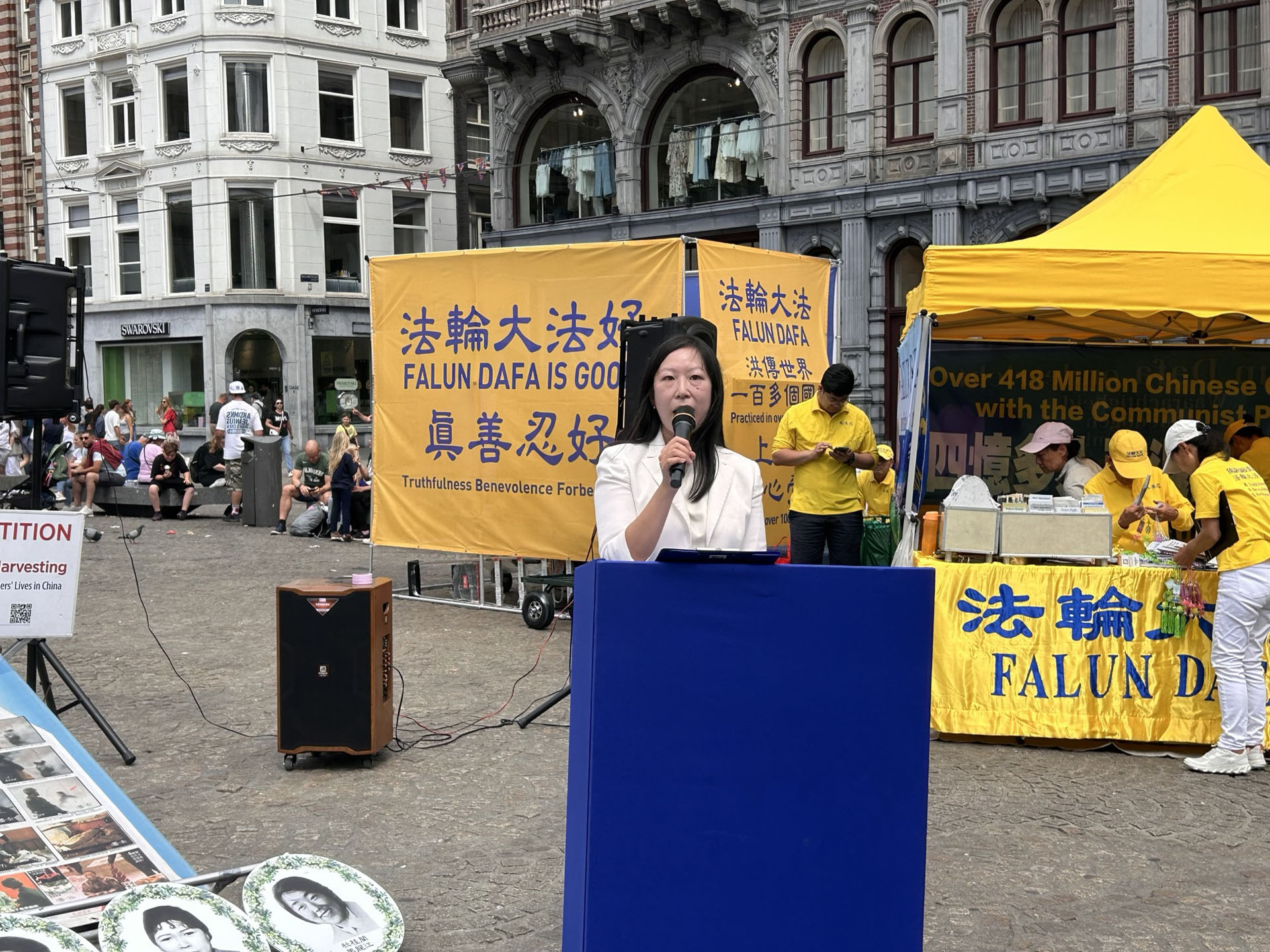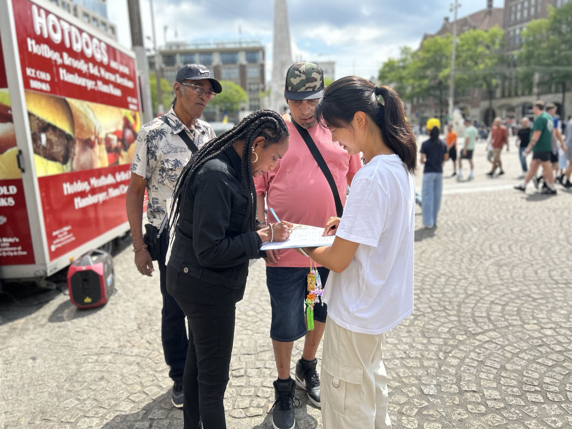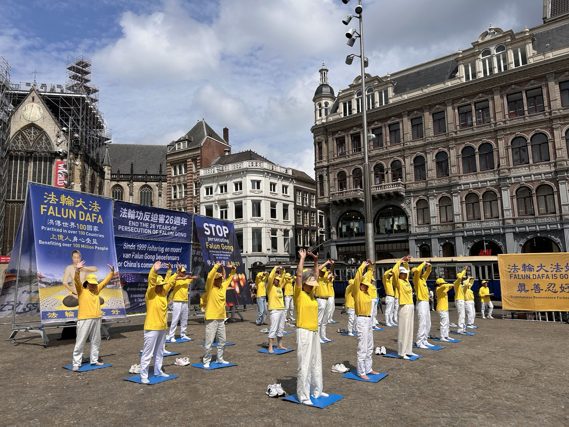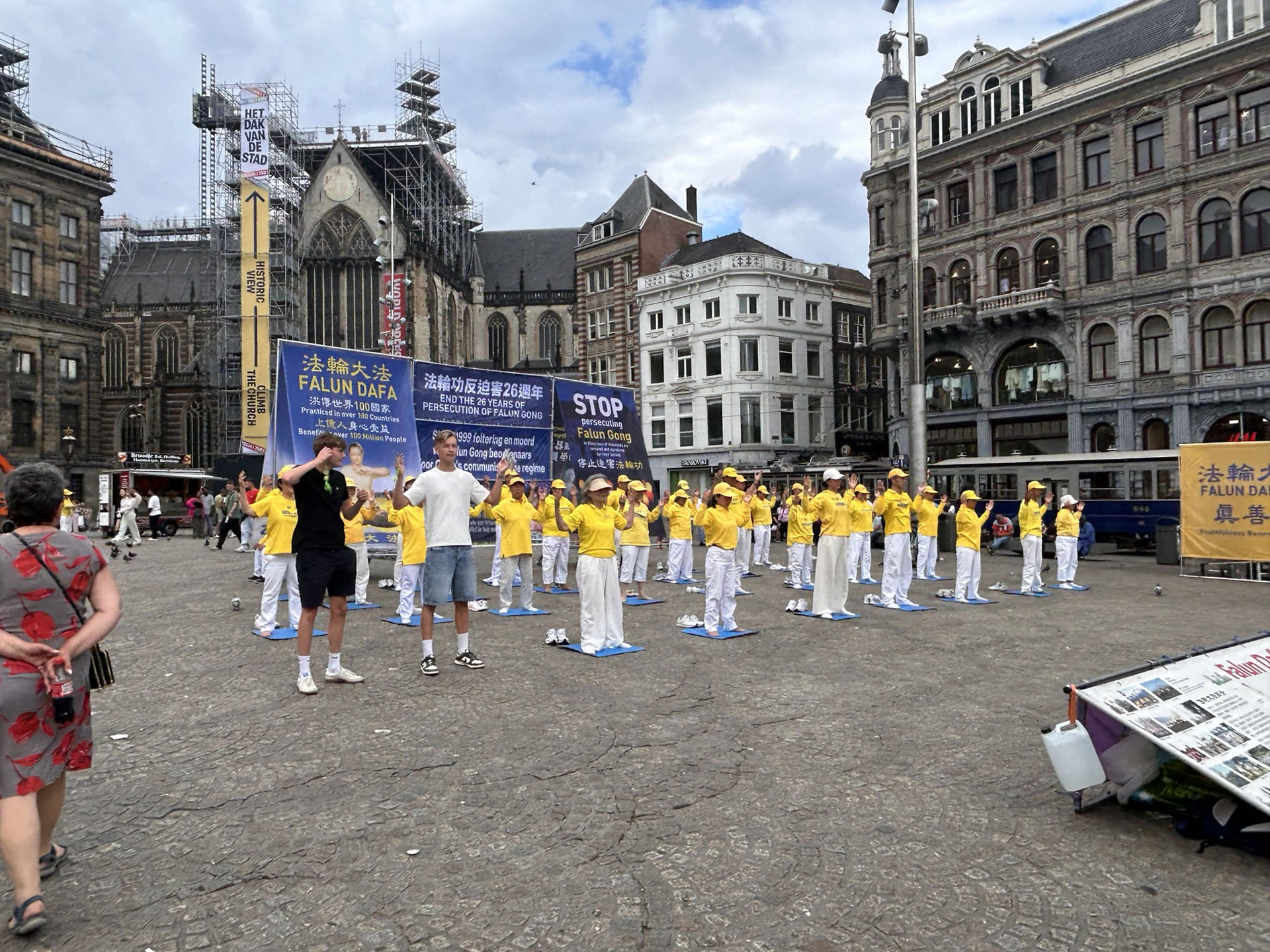 Falun Gong praktikanti iz cijele Holandije su se okupili na Trgu Dam u glavnom gradu Amsterdamu 20. jula 2025. godine. Oni su demonstrirali vježbe, govorili ljudima o progonu, prikupljali potpise za peticiju i odali počast kolegama praktikantima koji su izgubili živote tokom progona od strane Komunističke partije Kine (KPK). Pozvali su KPK da okonča svoju 26-godišnju kampanju progona, diskriminacije, torture i transnacionalne represije nad Falun Gong.