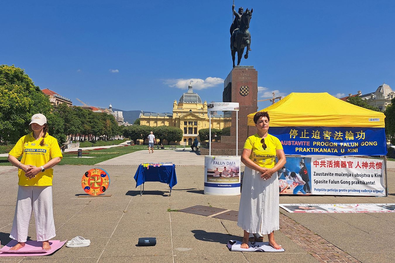 Praktikanti su postavili štand na Trgu kralja Tomislava u centru grada oko 9 sati ujutro. Jarko žuti šator i plavi transparenti privukli su pozornost ljudi na poruke na engleskom i kineskom jeziku, na kojima je pisalo: „Zaustavite progon Falun Gonga.“