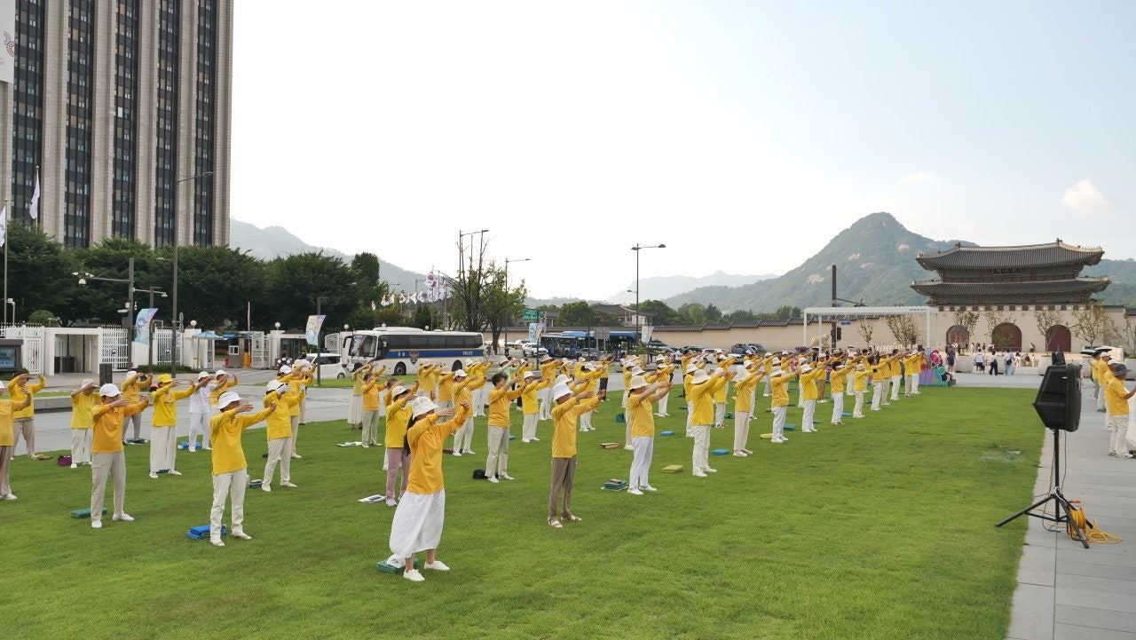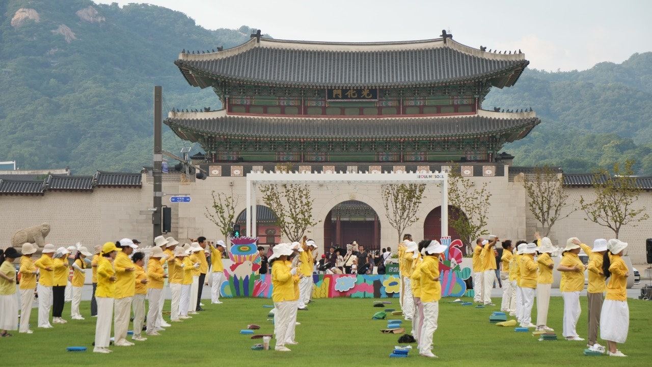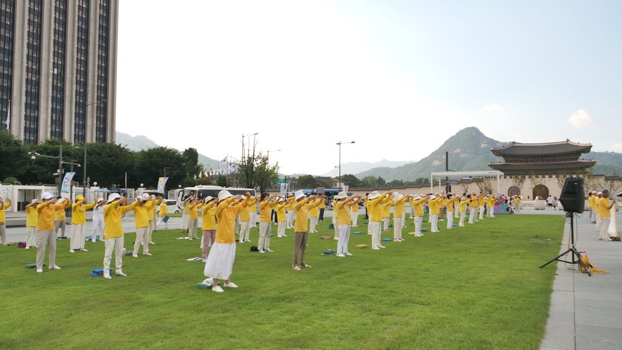 28. jula 2025, praktikanti su održali demonstraciju vežbi velikih razmera na trgu Gvanghvamun u Seulu, u Južnoj Koreji, kako bi predstavili Falun Dafu. Mnogi prolaznici su zastajali da gledaju, neki su slikali i snimali, a neki su se pridružili praktikantima i pratili vežbe. Mnogi su uzeli informativne letke o Falun Dafi.