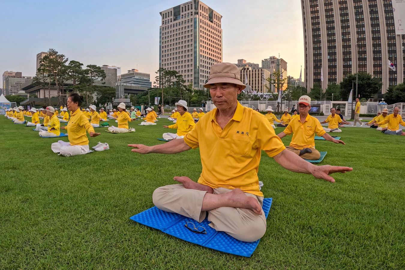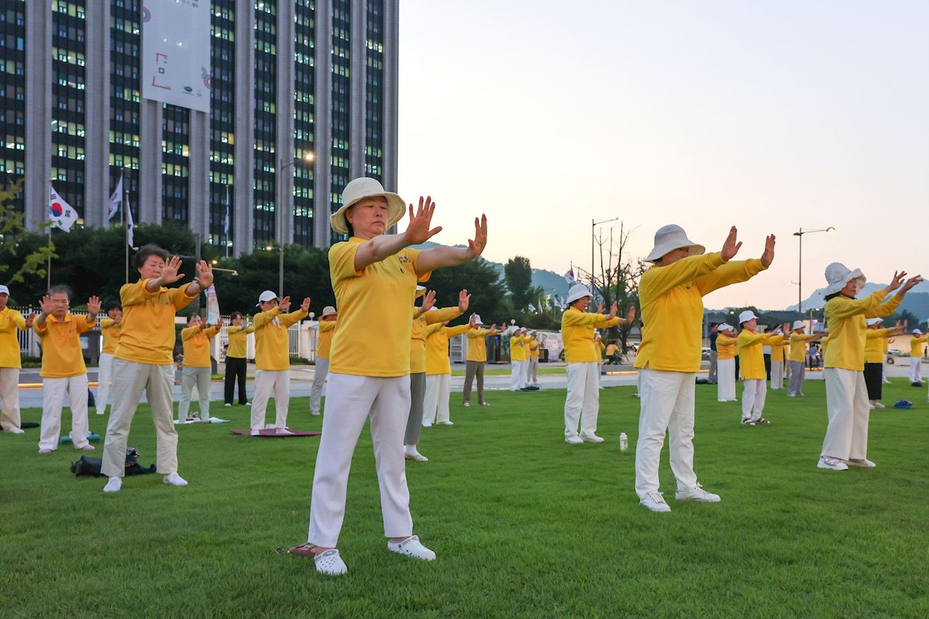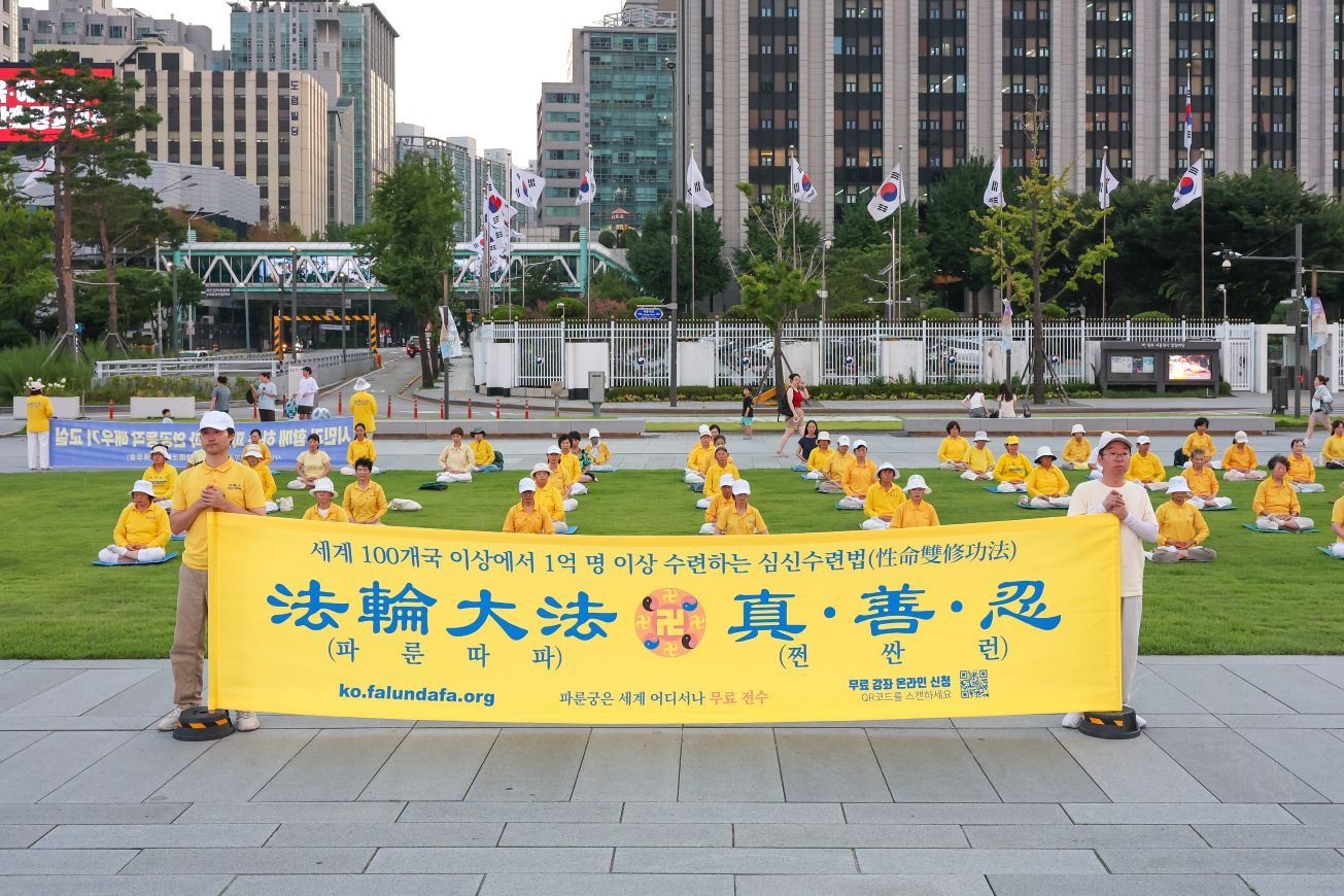 28. jula 2025, praktikanti su održali demonstraciju vežbi velikih razmera na trgu Gvanghvamun u Seulu, u Južnoj Koreji, kako bi predstavili Falun Dafu. Mnogi prolaznici su zastajali da gledaju, neki su slikali i snimali, a neki su se pridružili praktikantima i pratili vežbe. Mnogi su uzeli informativne letke o Falun Dafi.