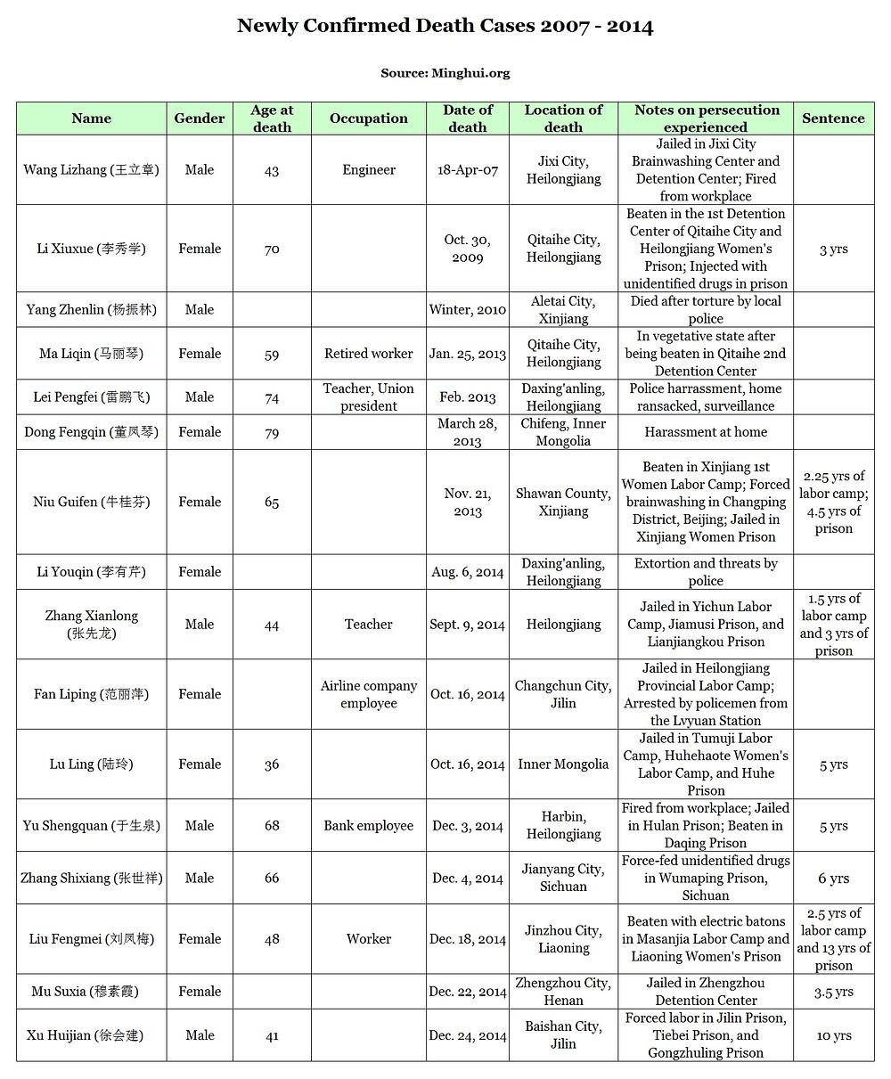 Nadalje, nedavno su potvrđene i smrti 16 Falun Gong praktikanata koji su bili pritvoreni od 2007. do 2014., a o njihovim sudbinama se do sada moglo samo nagađati. Među 30 preminulih je 18 žena i 12 muškaraca, u dobi od 36 do 79 godina. Neki su bili osuđeni na zatvorsku kaznu, a drugi na rad u radnom logoru ili na pritvor u centrima za ispiranje mozga. Najduža izrečena kazna je bila 13 godina.