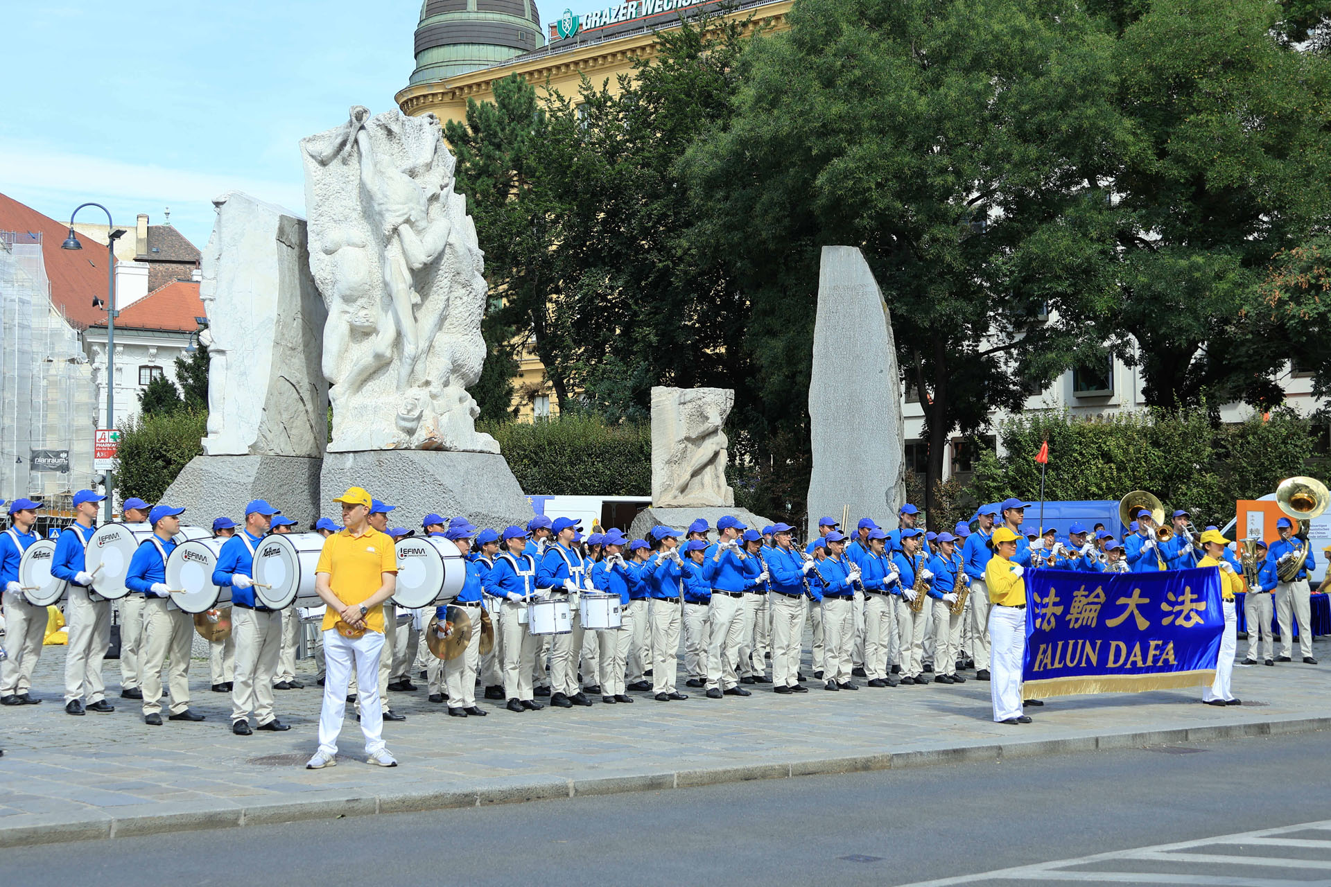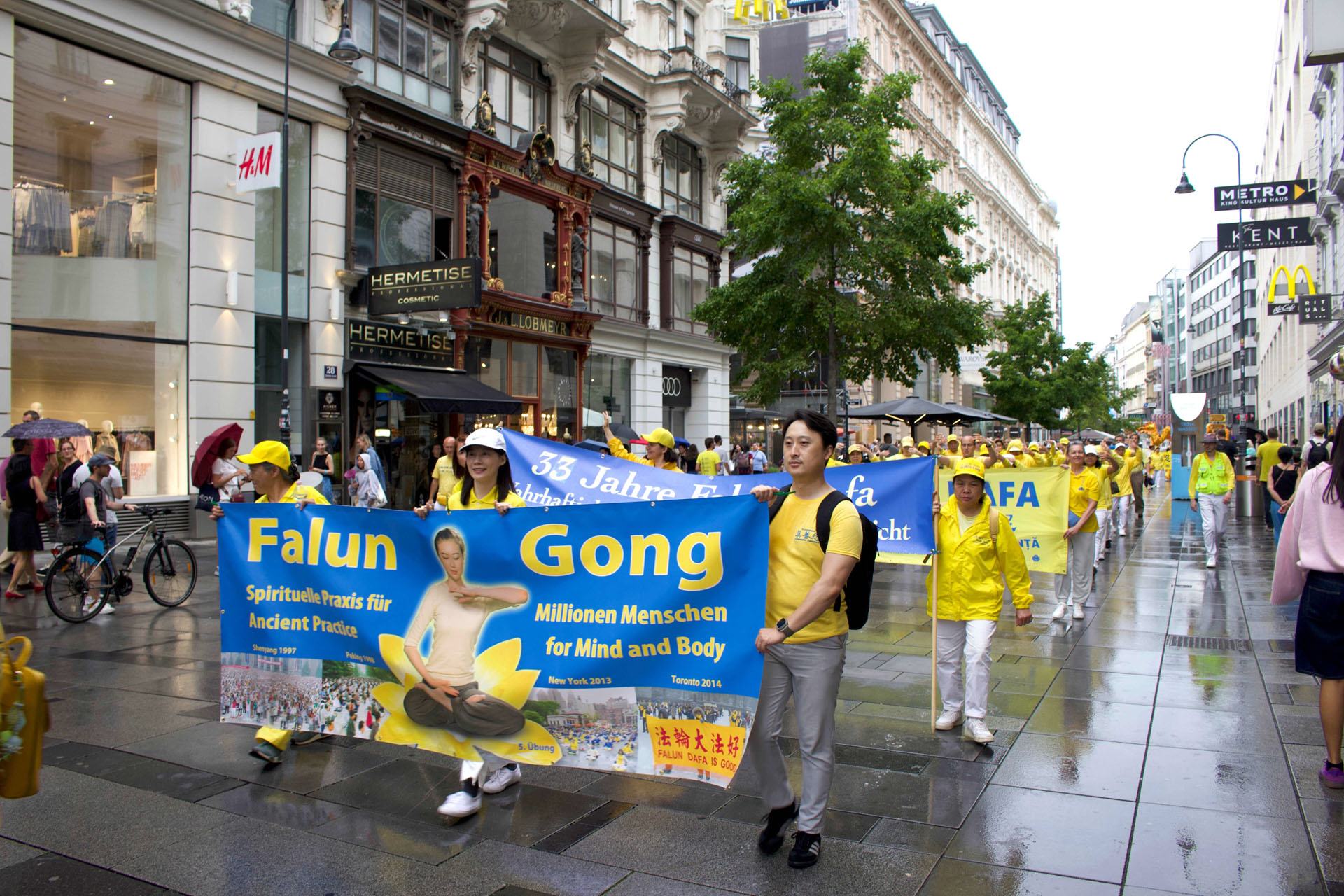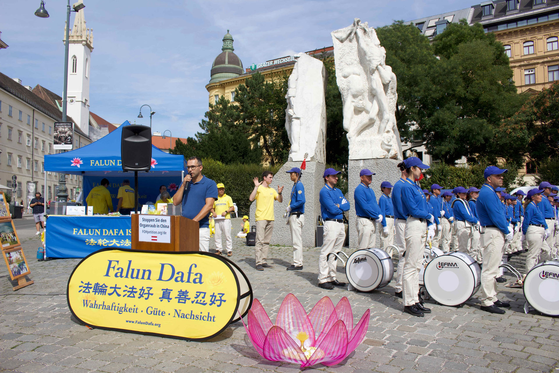 Osim što su ljudima govorili o dobrobitima Falun Dafa, putem plakata i govora na Helmut-Zilk-Platz-u, praktikanti su također objasnili kako KPK proganja praktikante 26 godina.
