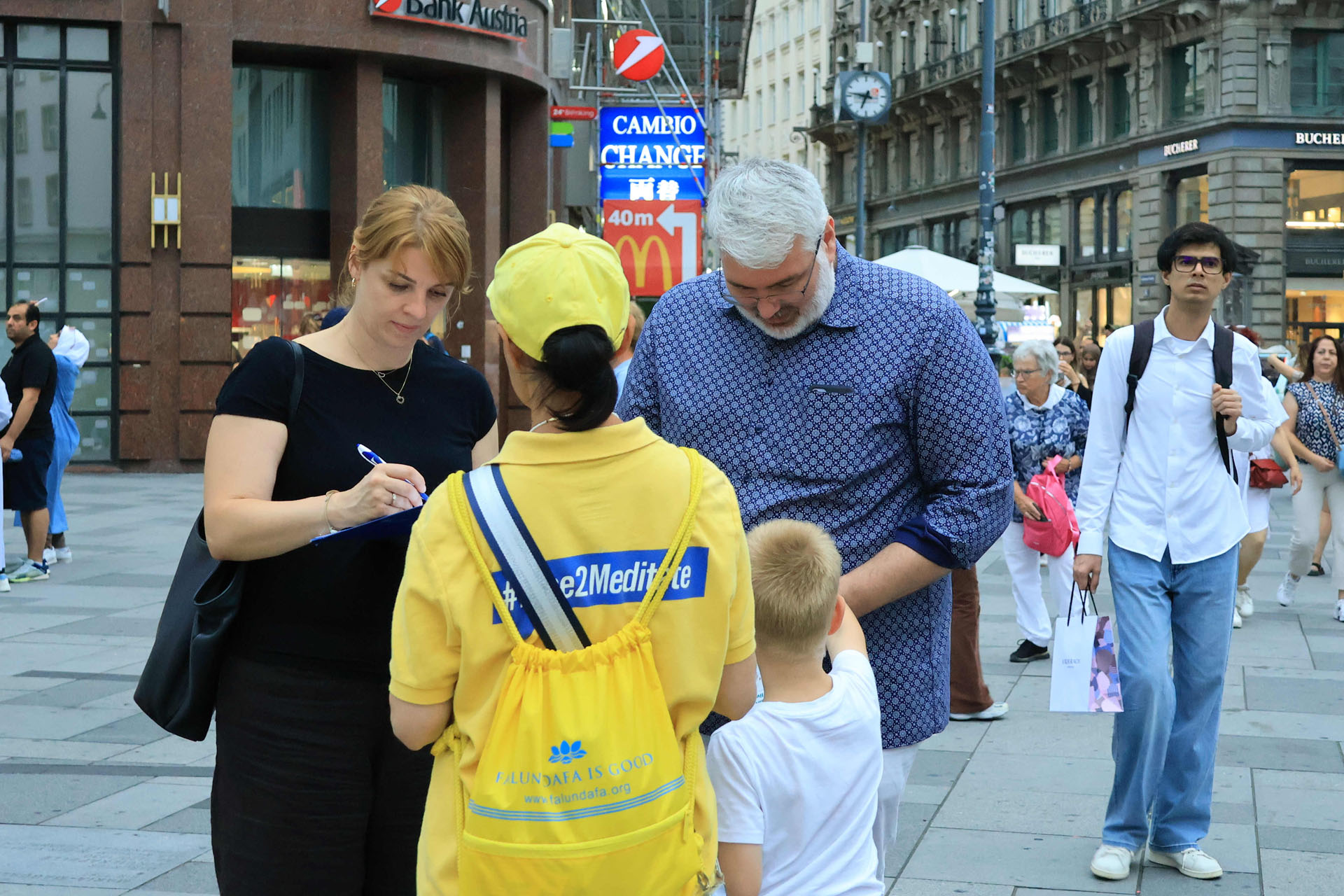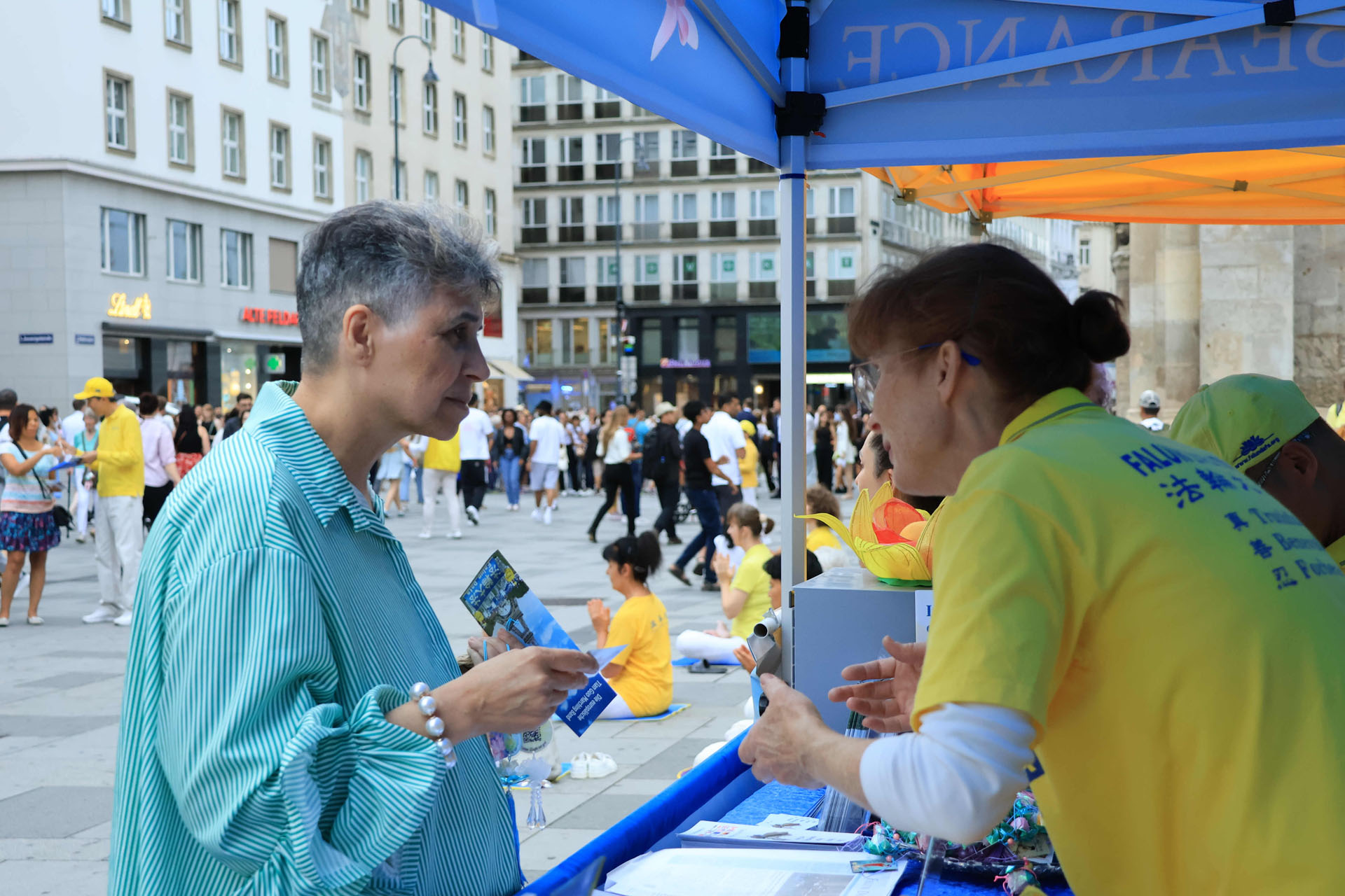 Katedrala Svetog Stefana, koja se uzdiže iznad trga Stephansplatz, je nezaobilazna destinacija za turiste. To je također popularno mjesto gdje se okupljaju mještani i trg je čak prometan i noću. Ljudi koji su prolazili trgom su pažljivo slušali govore praktikanata kako bi saznali o progonu u Kini; neki su uzimali letke i postavljali pitanja; drugi su gledali fotografije koje su prikazivale razne mirne aktivnosti održane tokom proteklih 26 godina kako bi se razotkrile brutalnosti; neki su došli do privlačnog plavog šatora da uzmu više materijala. Ljudi su potpisali peticiju koja poziva Komunističku partiju Kine (KPK) da prestane progoniti Falun Gong i vršiti žetvu organa od njih.