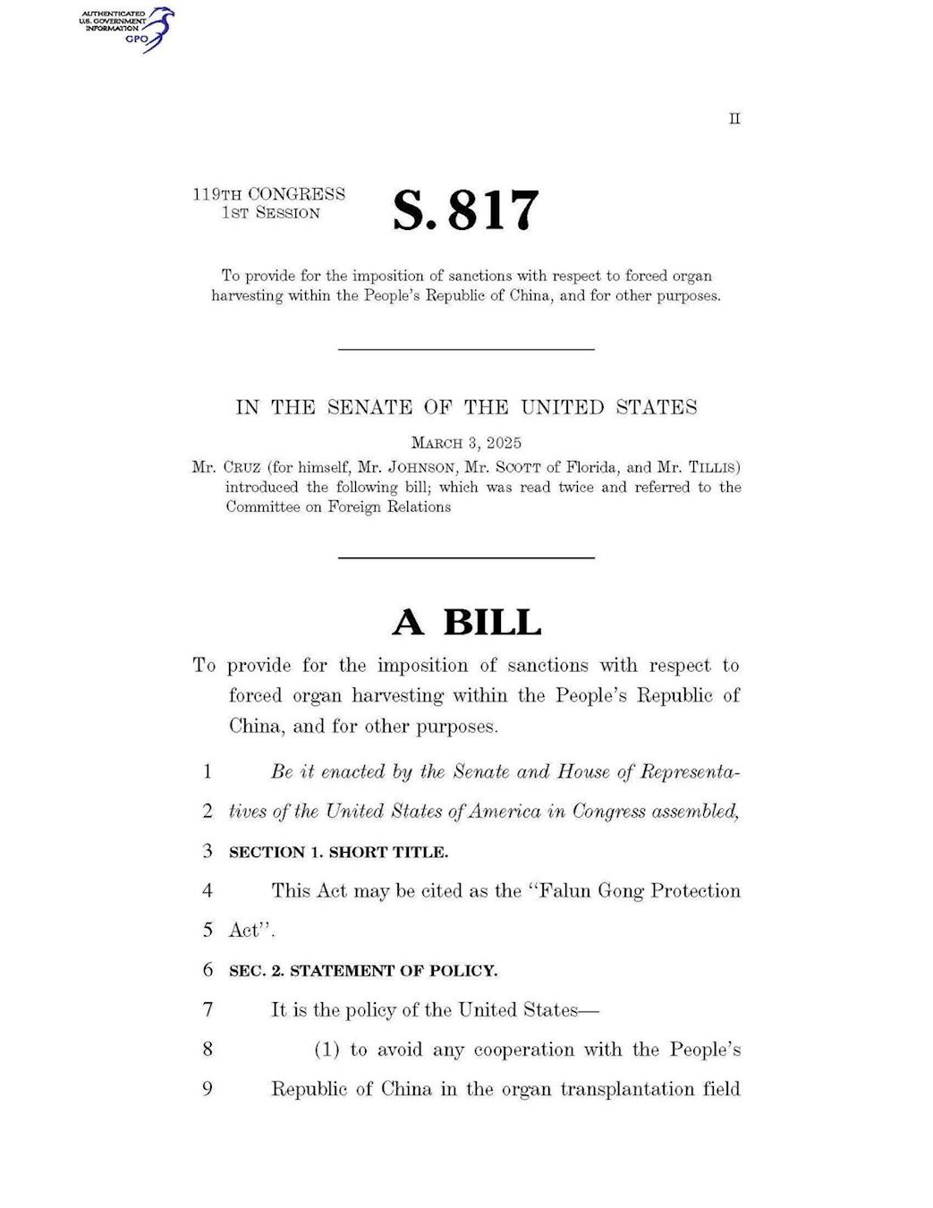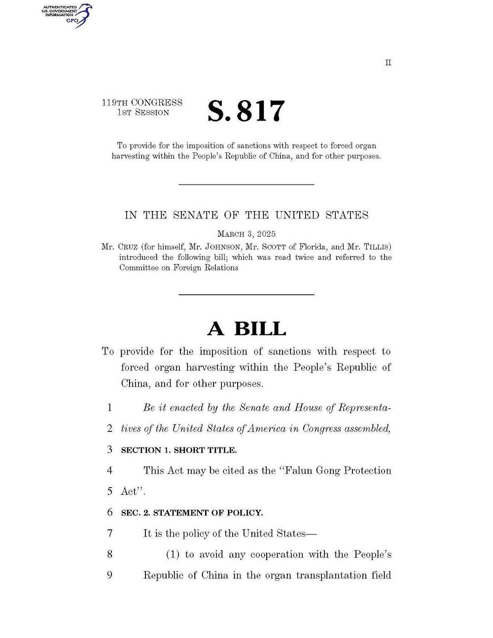 Zakon o zaštiti Falun Gonga (prijedlog zakona S.817) predstavio je senator Ted Cruz 3. ožujka ove godine. Prijedlog zakona predviđa uvođenje sankcija u vezi s prisilnim vađenjem organa unutar Narodne Republike Kine.