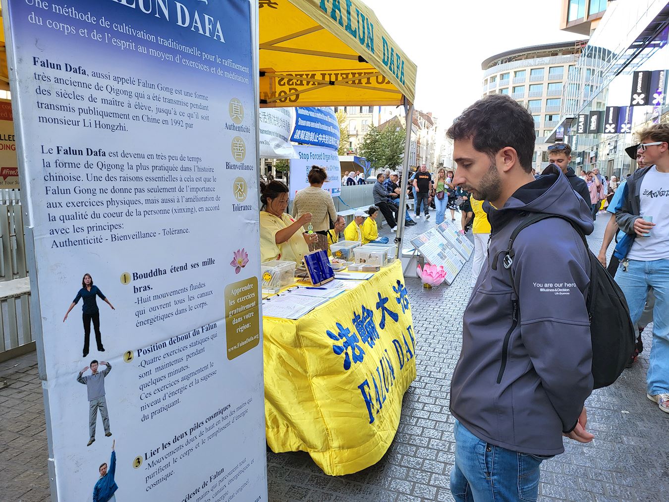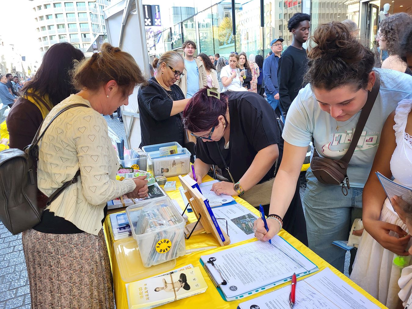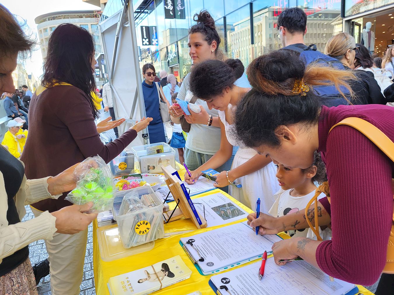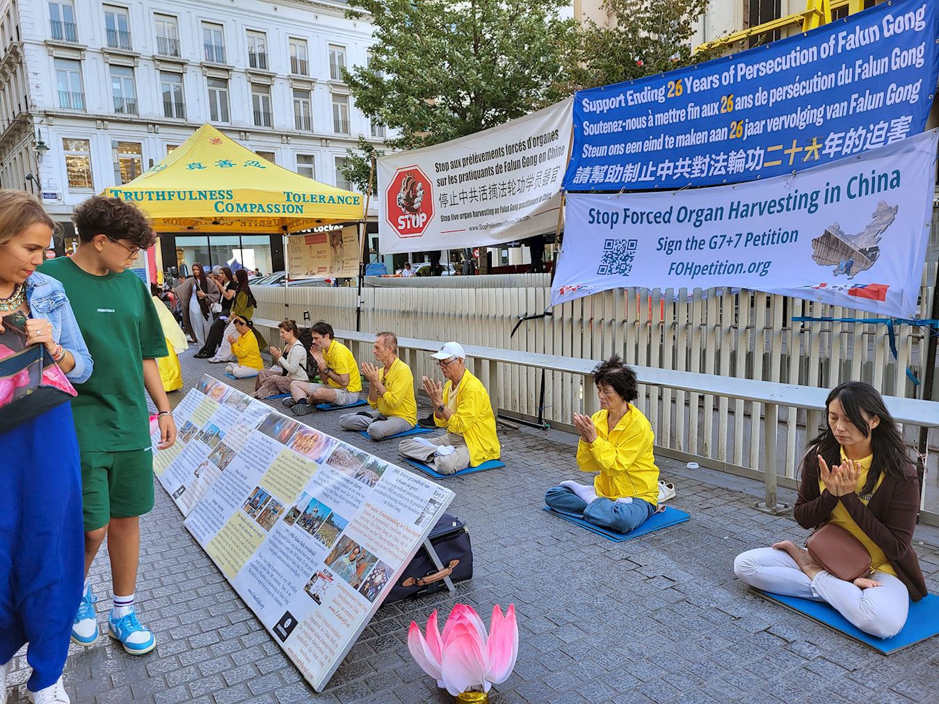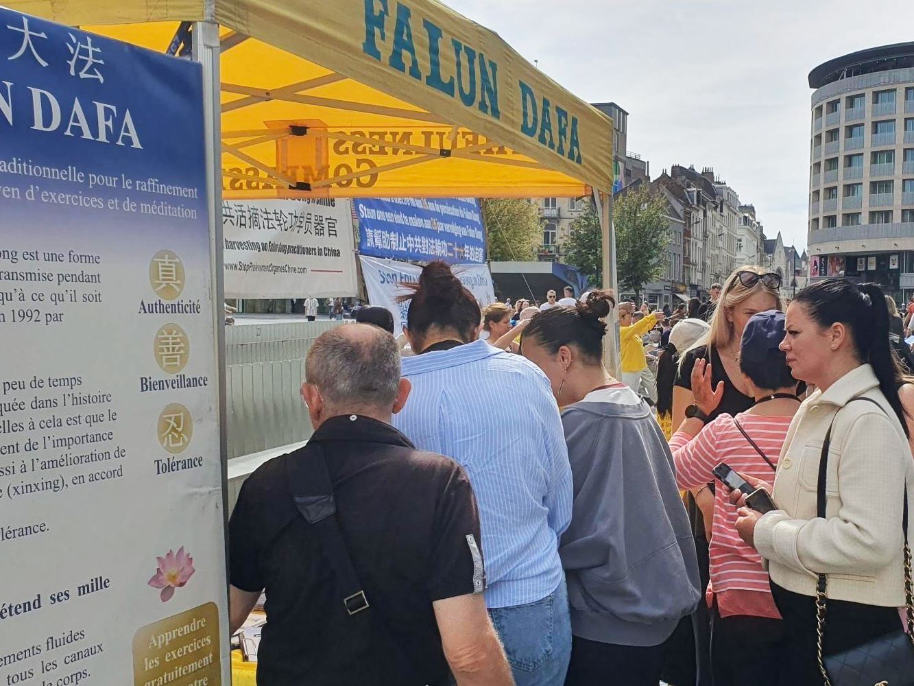 Tokom događaja u Briselu 8. septembra 2025. godine, praktikanti su ljudima govorili o progonu Falun Dafe od strane Komunističke partije Kine (KPK) i državnoj žetvi organa. Mnogi prolaznici su se zaustavili da pročitaju transparente i potpisali peticiju za okončanje kršenja ljudskih prava.