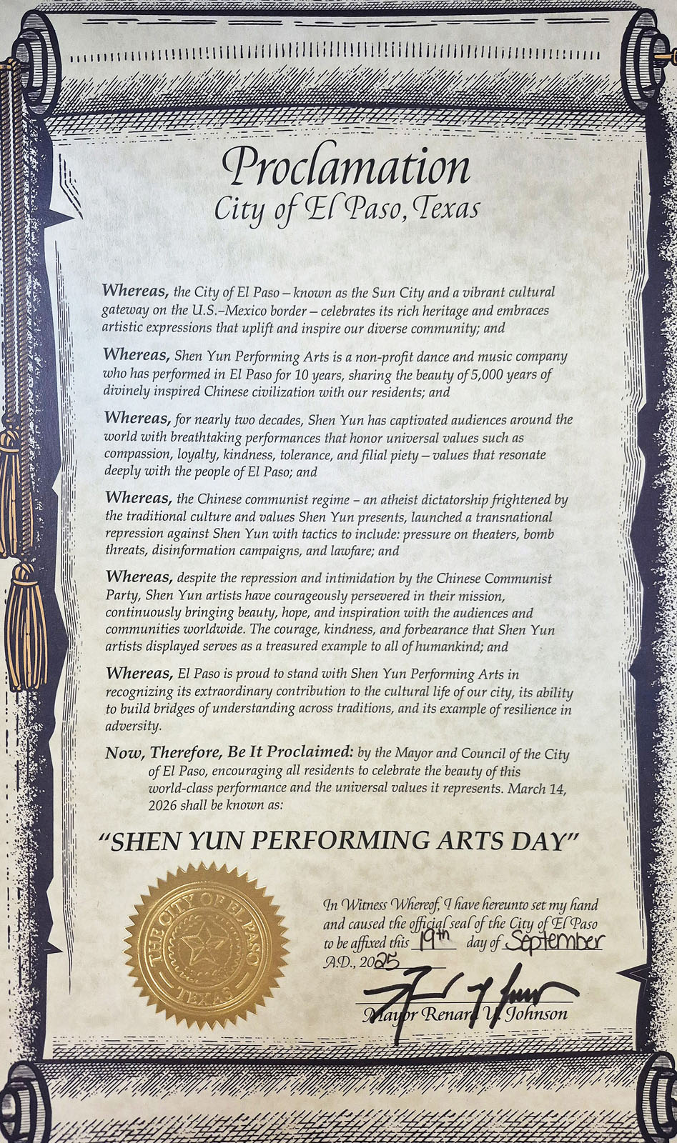 „Stoga, neka se proglasi sljedeće: gradonačelnik i Gradsko vijeće EI Pasa, potiče sve stanovnike da slave ljepotu ove vrhunske umjetničke trupe i univerzalne vrijednosti koje ista predstavlja. Dan 14. ožujka 2026. bit će poznat kao: ‘SHEN YUN PERFORMANCE ARTS DAN.’”