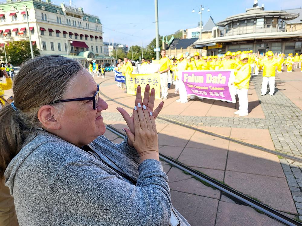 Vidjevši da praktikanti slave svoje uvjerenje na miran način i prenose dobre poruke Falun Dafa ljudima u Švedskoj uprkos progonu, gđa Huckridge je kazala: „Ovo je zaista nešto dobro za čovječanstvo.“