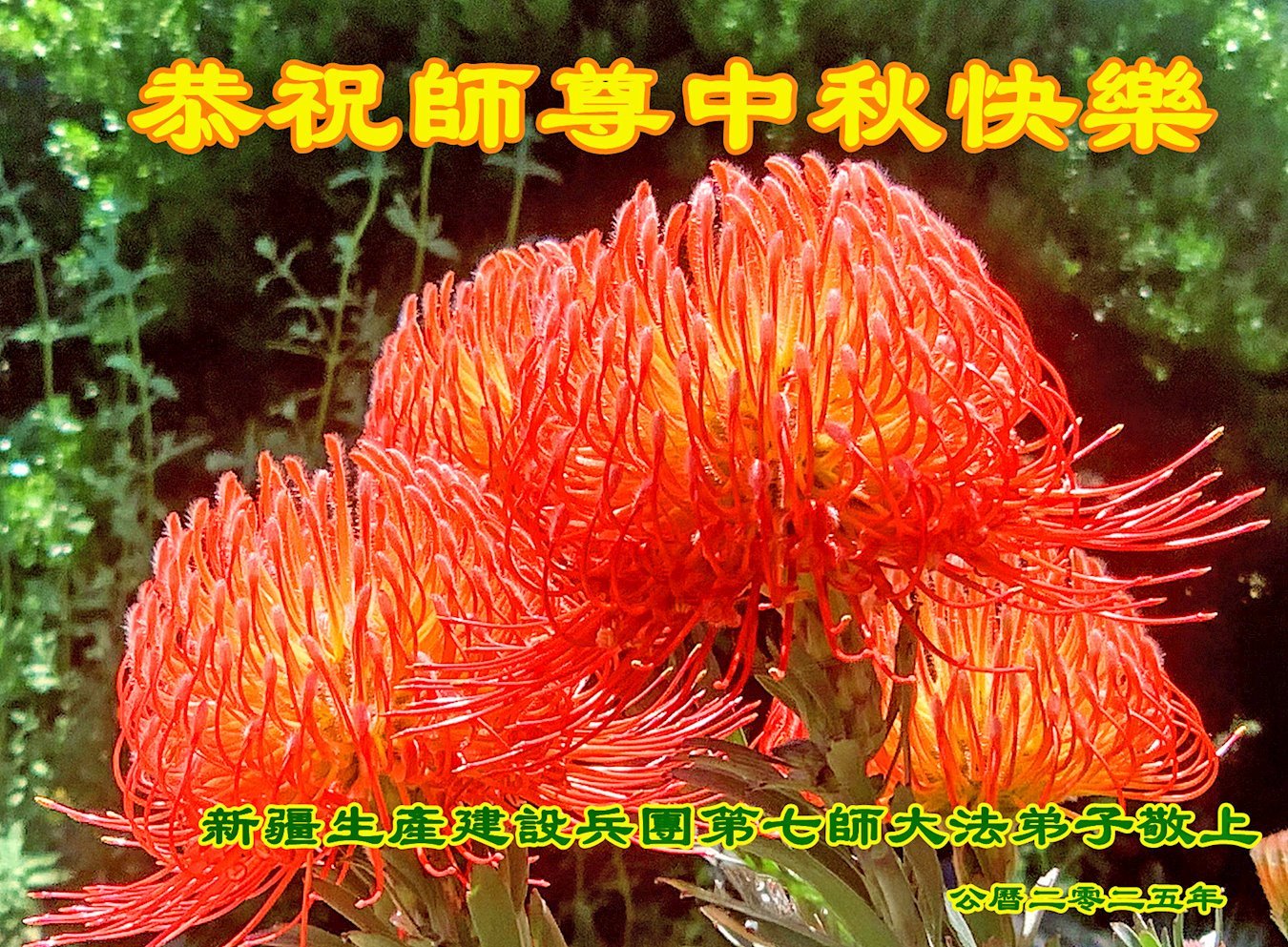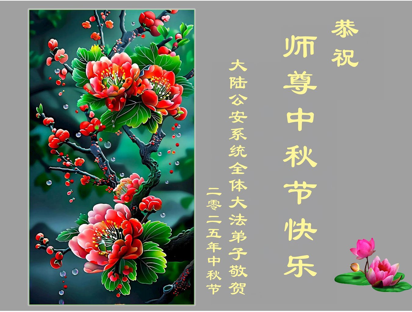 Uoči Praznika sredine jeseni 2025. godine, praktikanti Falun Dafe u kineskom vojnom sistemu, organima za sprovođenje zakona, tužilaštvima, sudovima i pravosudnim biroima, kao i u vladi, poslali su svoje čestitke kako bi poželeli Učitelju Li Hongdžiju, osnivaču Falun Dafe, srećan Praznik sredine jeseni.