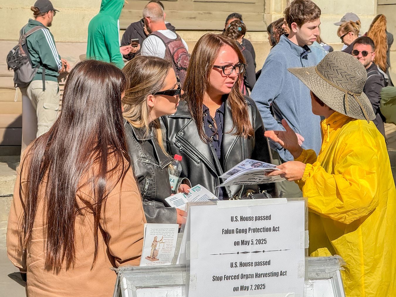 Mlada žena iz Kine se zaustavila da razgovara i kazala da radi u e-trgovini. Ispričala je kako je, dok je bila u Kini, često koristila softverske alate da zaobiđe blokadu interneta koju je nametnula KPK i bila je u mogućnosti da čita izvještaje iz medija koje vode praktikanti Falun Dafa. „Živjela sam u Sjedinjenim Državama šest mjeseci i znam da je KPK vrlo opaka u progonu Falun Dafa“, rekla je. „Prisilna žetva organa je užasna, a takozvano samospaljivanje na trgu Tiananmen je bilo prevara koju je KPK postavila da ocrni Falun Dafa.“