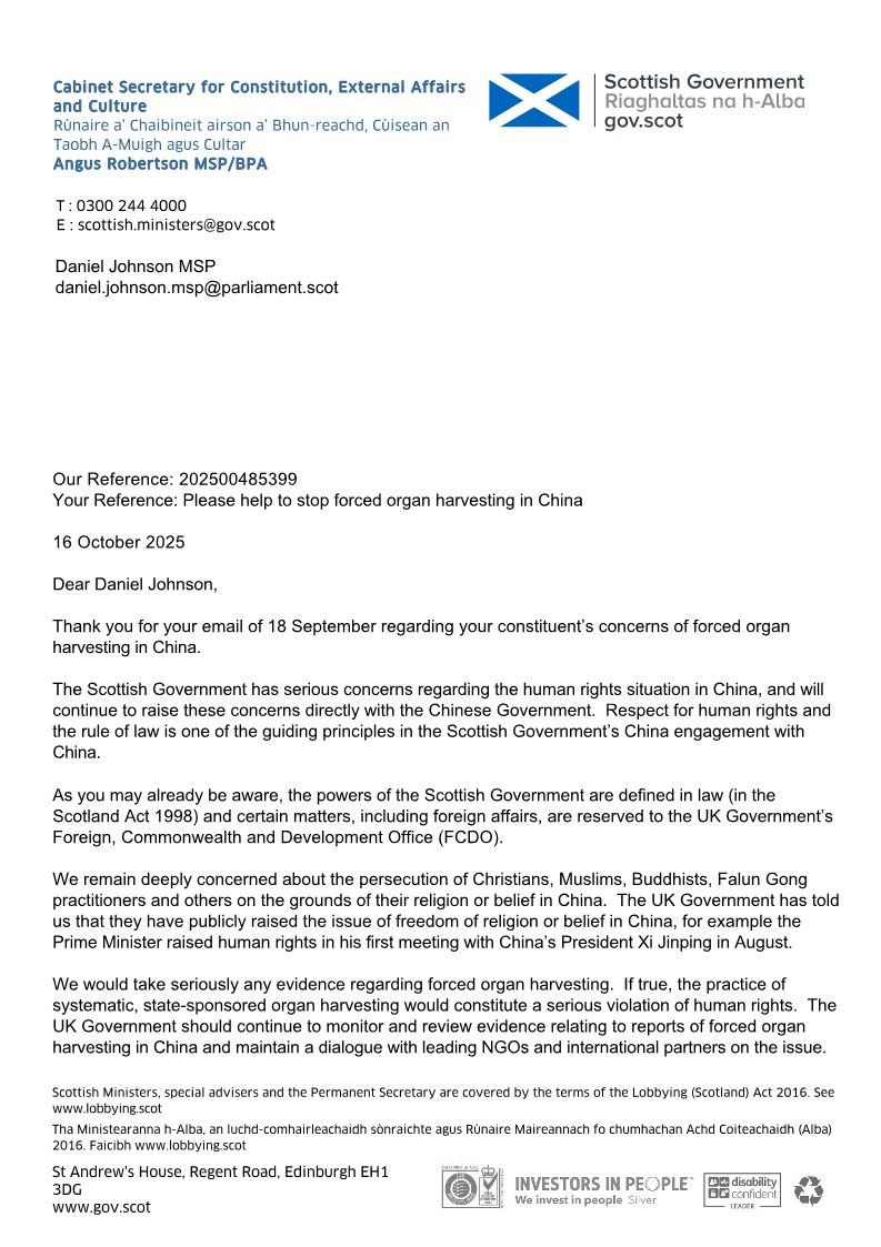 Gospodin Angus Robertson, sekretar Kabineta za ustav, vanjske poslove i kulturu, Škotska, je u svom pismu upućenom Danielu Johnsonu, zastupniku škotskog parlamenta (MSP), 16. oktobra 2025. godine, izjavio: „Vlada Škotske je ozbiljno zabrinuta zbog stanja ljudskih prava u Kini i nastavit će direktno izražavati ove zabrinutosti kineskoj vladi. Poštovanje ljudskih prava i vladavina zakona su jedni od vodećih principa u angažmanu Vlade Škotske sa Kinom.“