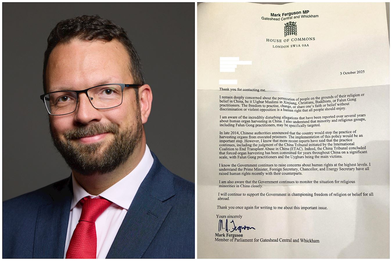 Mark Ferguson, zastupnik, je napisao: „Ostajem duboko zabrinut zbog progona ljudi na osnovu njihove religije ili vjerovanja u Kini, bilo da se radi o ujgurskim muslimanima u Xinjiangu, kršćanima, budistima ili Falun Gong praktikantima. Sloboda prakticiranja, mijenjanja ili dijeljenja svoje vjere ili vjerovanja bez diskriminacije ili nasilnog protivljenja je ljudsko pravo koje bi svi ljudi trebali uživati.