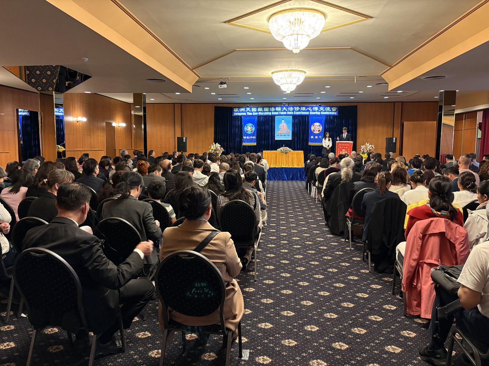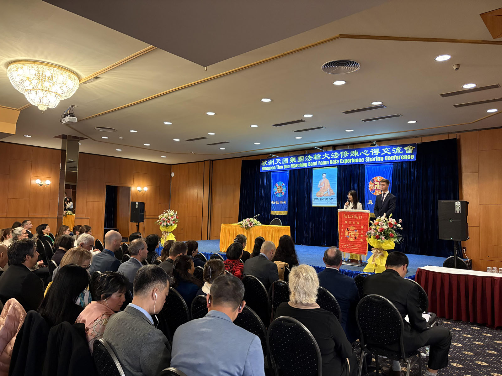 Dva člana benda bila su voditelji konferencije. U svojim uvodnim riječima, rekli su: „Kao članovi marširajućeg orkestra Tian Guo, mi potvrđujemo Fa i spašavamo živa bića kroz muziku. U tom procesu neprestano kultiviramo sebe, oslobađamo se vezanosti, poboljšavamo svoj karakter, radimo zajedno i formiramo jedno tijelo.“