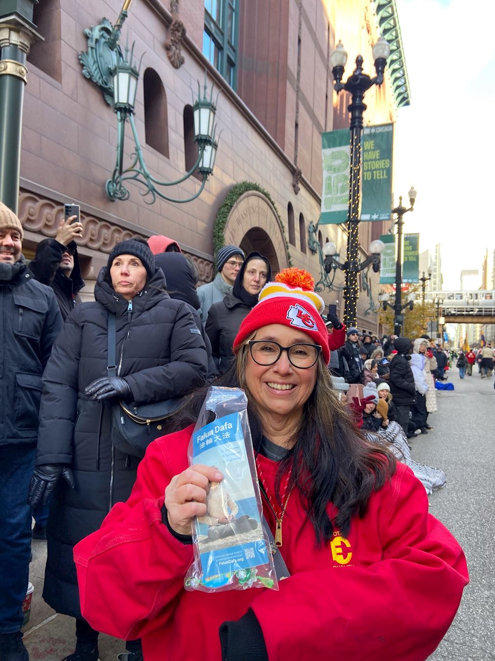 Rekla je da je Dan zahvalnosti praznik koji je navodi da razmišlja i još više ceni Falun Dafu. Njeni roditelji i deca imali su koristi od praktikovanja Dafe. „Zaista sam zahvalna što praktikujem kultivaciju“, rekla je. „Nadam se da ljudi mogu osetiti pozitivnu energiju i toplinu Falun Dafe na ovaj hladni praznik putem ove parade.“