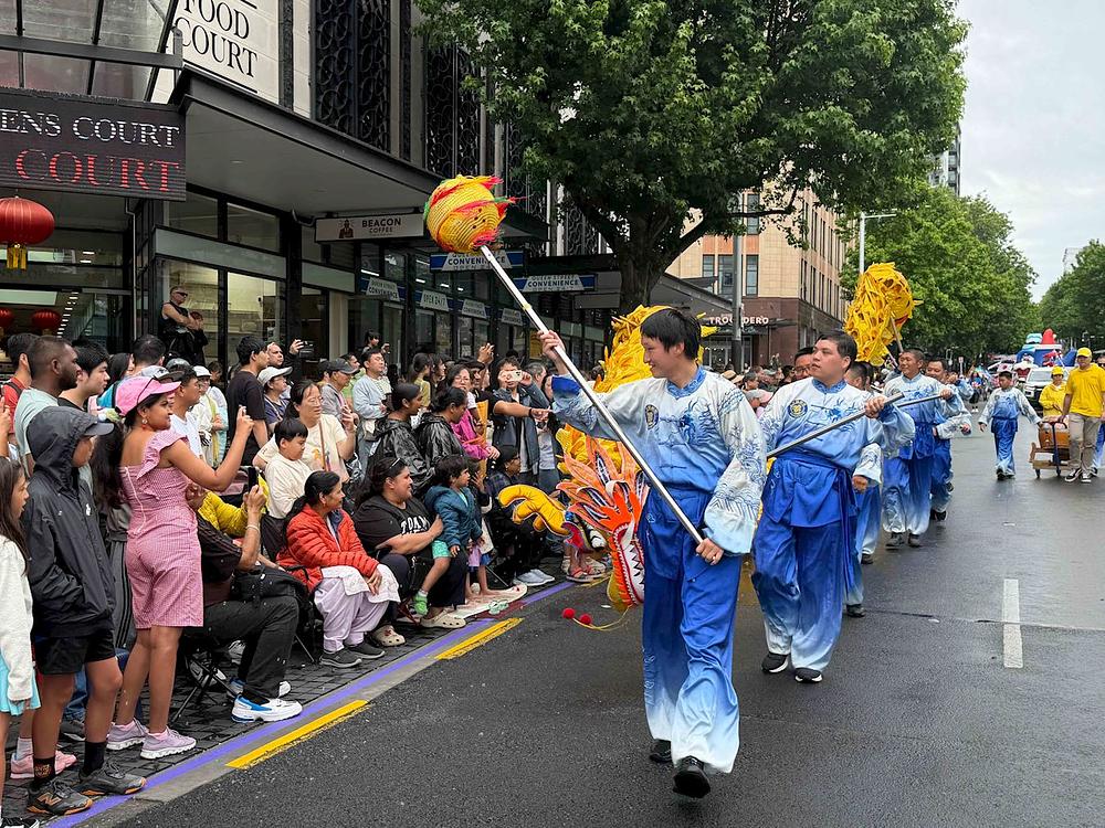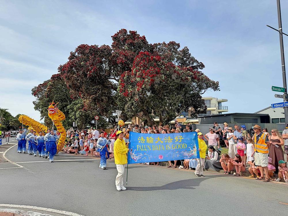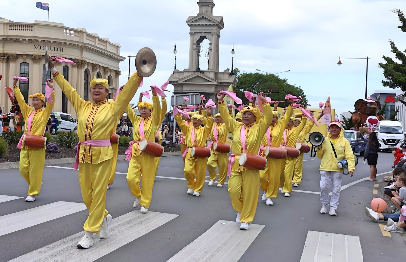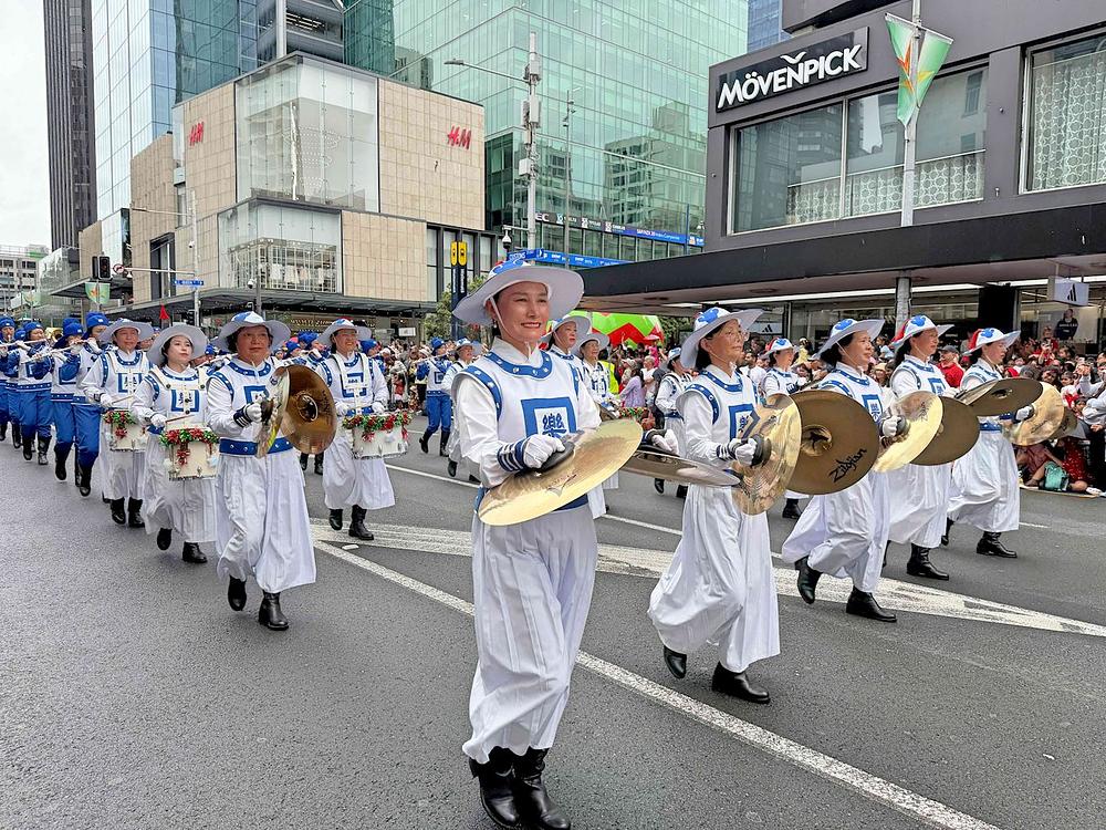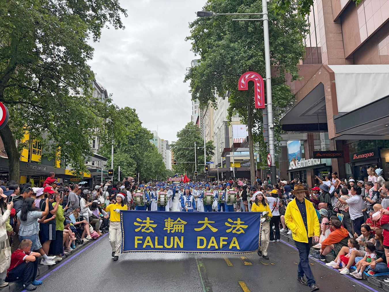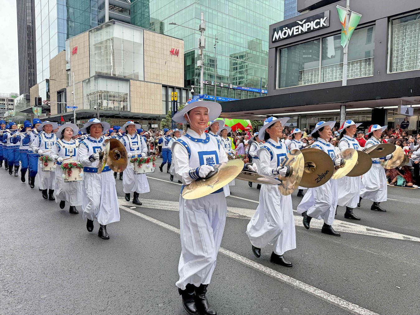 Gledaoci su toplim aplauzom pozdravili Tian Guo marširajući orkestar, sastavljen od Falun Dafa praktikanata sa Novog Zelanda i iz Australije. Ljudi su se fotografisali, hvalili orkestar zbog plavo-belih uniformi i rekli da se muzika orkestra savršeno uklopila u prazničnu atmosferu događaja. Upečatljivi transparenti „Istinitost-Blagost-Trpeljivost“ krasili su pokretnu platformu, koju je pratio tim zmajevog plesa, u čemu su deca zaista uživala.