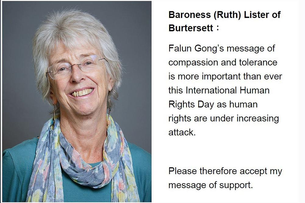 Baronesa (Rut) Lister od Barterseta napisala je: „Falun Gong poruka saosećanja i tolerancije važnija je nego ikad ovog Međunarodnog dana ljudskih prava jer su ljudska prava pod sve većim napadom. Stoga vas molim da prihvatite moju poruku podrške.“