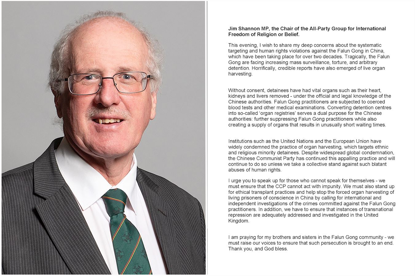 „Pozivam vas da progovorite u ime onih koji ne mogu sami da govore – moramo osigurati da KPK ne može delovati nekažnjeno. Takođe se moramo zalagati za etičke prakse transplantacije i pomoći da se zaustavi prisilna žetva organa od živih zatvorenika savesti u Kini pozivanjem na međunarodne i nezavisne istrage zločina počinjenih nad Falun Gong praktikantima. Pored toga, moramo osigurati da se slučajevi transnacionalne represije adekvatno rešavaju i istražuju u Ujedinjenom Kraljevstvu.“