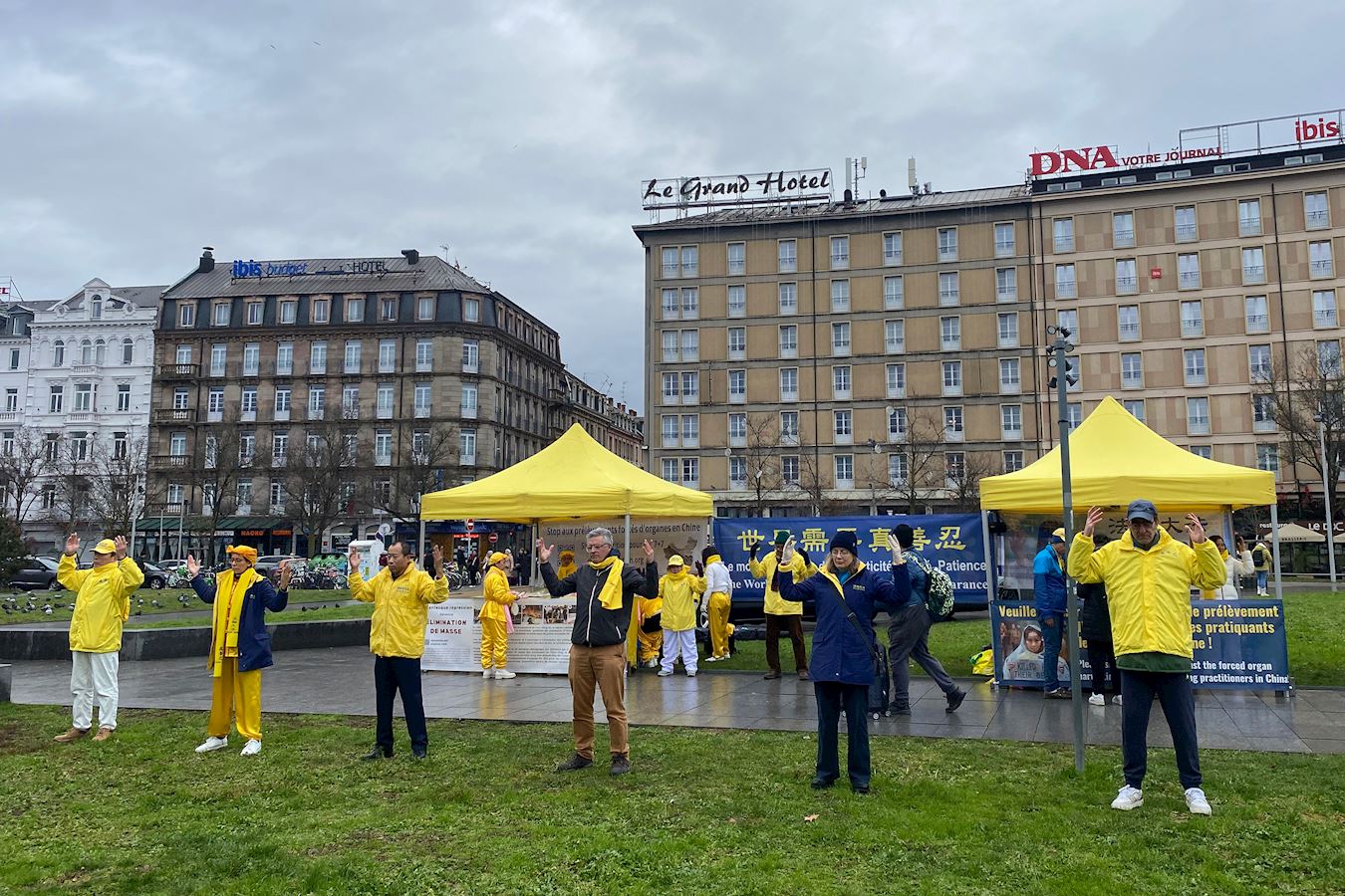 Iako je tog dana padala lagana kiša, te subote prije zimskog odmora, na Trgu Republike i dalje je bilo puno ljudi. Praktikanti su demonstrirali vježbe Falun Gonga i dijelili informacije prolaznicima. Demonstracija vježbi privukla je mnoge da se zaustave i fotografiraju. Neki su ljudi fotografirali i informativne ploče. Brojni su rekli da su bili dirnuti saznanjem o progonu i potpisali su peticiju protiv prisilnog vađenja organa. Mnogi su zahvalili praktikantima što su tamo.
