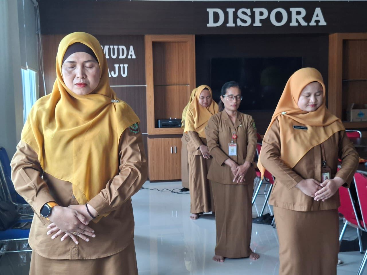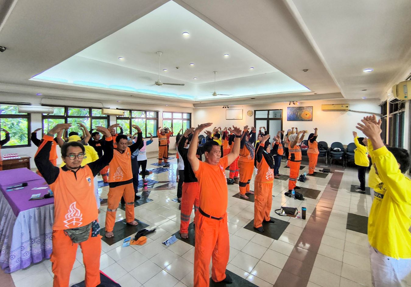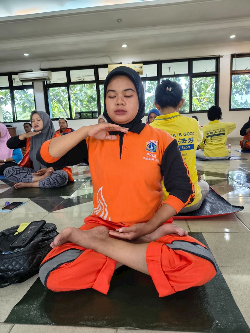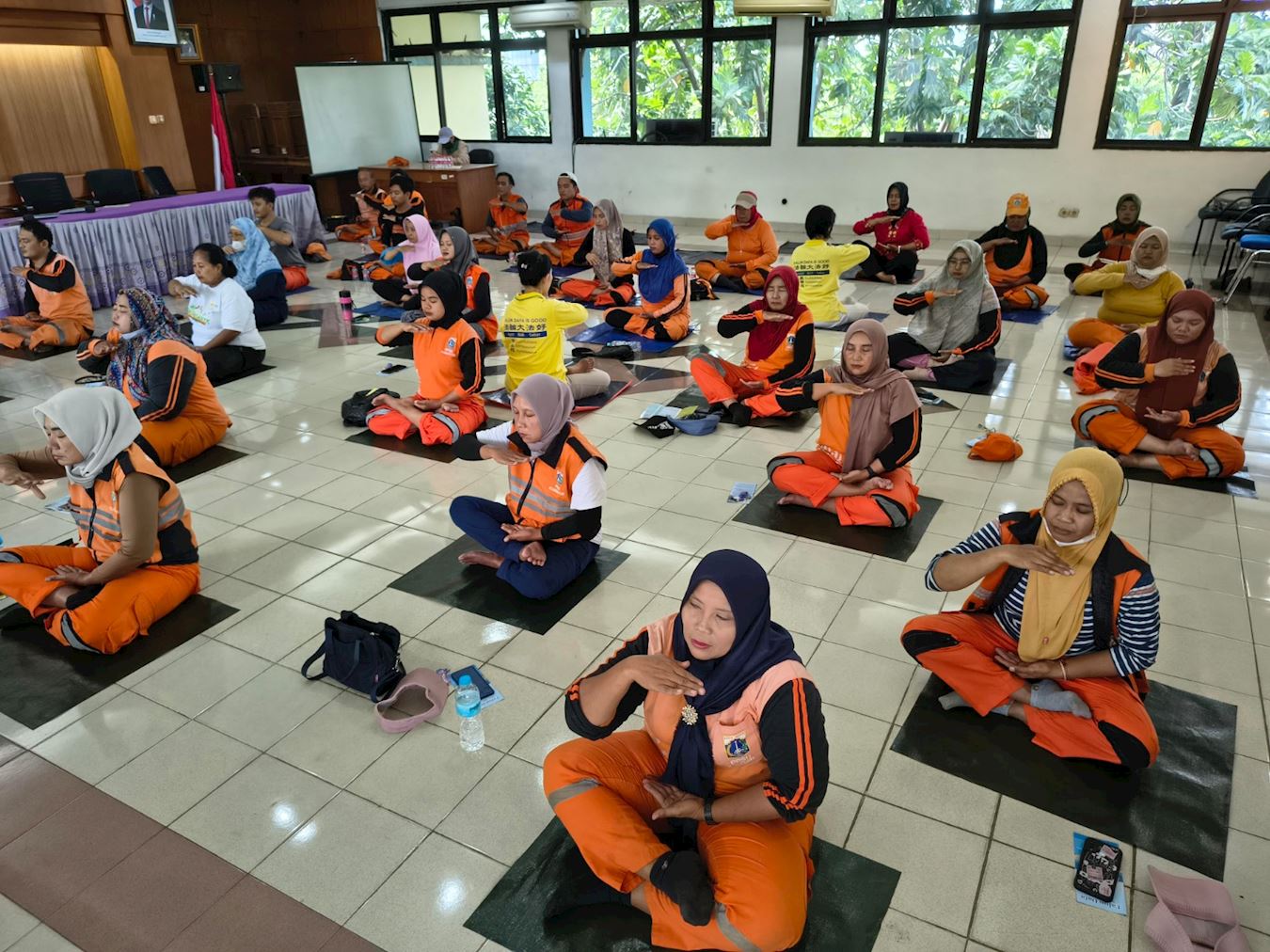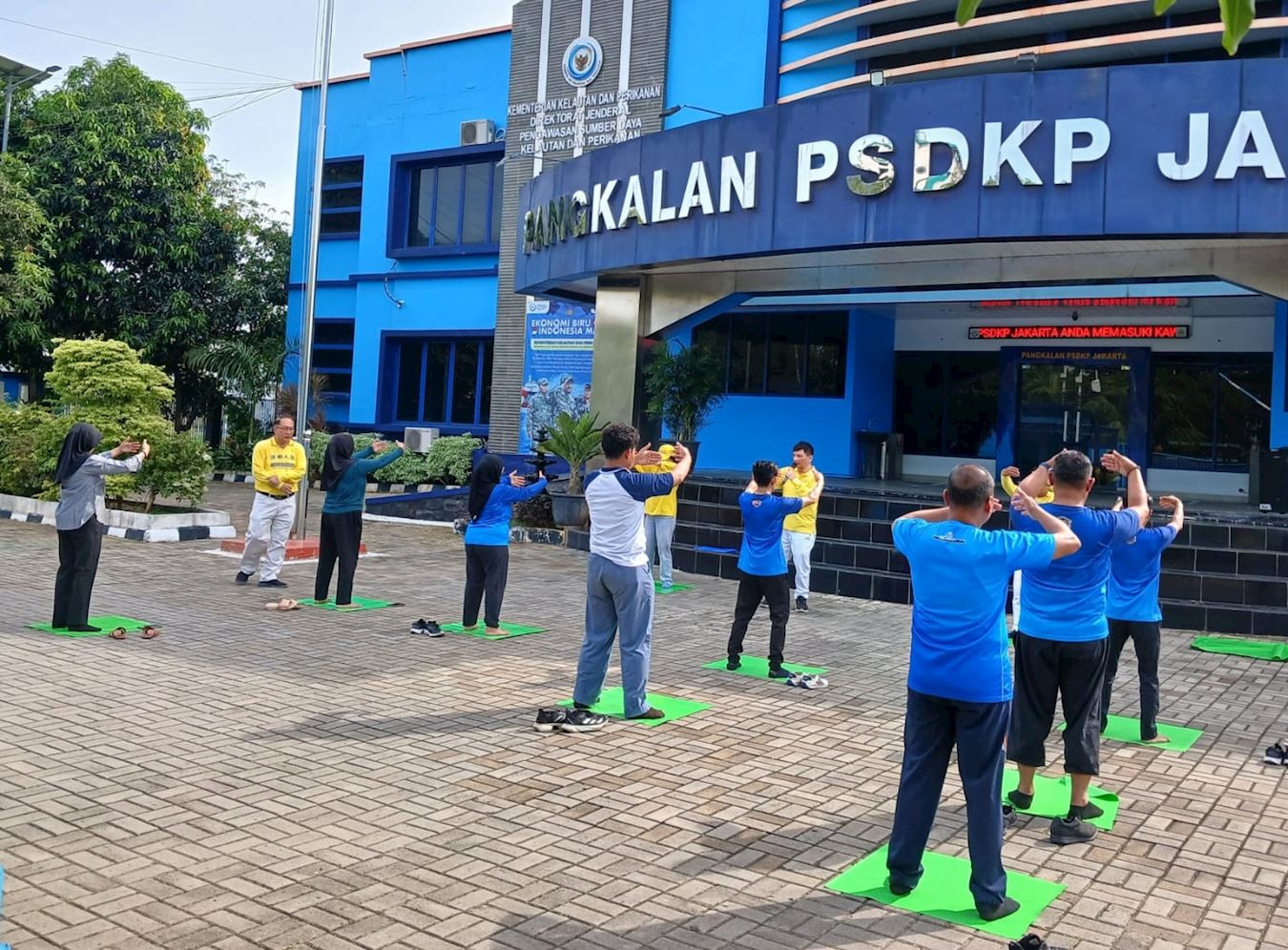Deseci zaposlenika u jedinici za upravljanje javnom infrastrukturom i objektima podokružnog ureda Pluit u sjevernoj Jakarti, zajedno s nekoliko zaposlenika u Jedinici za nadzor morskih resursa i ribarstva, radnoj skupini pod Ministarstvom pomorstva i ribarstva, učili su vježbe Falun Dafa u petak ujutro, 28. studenog 2025.