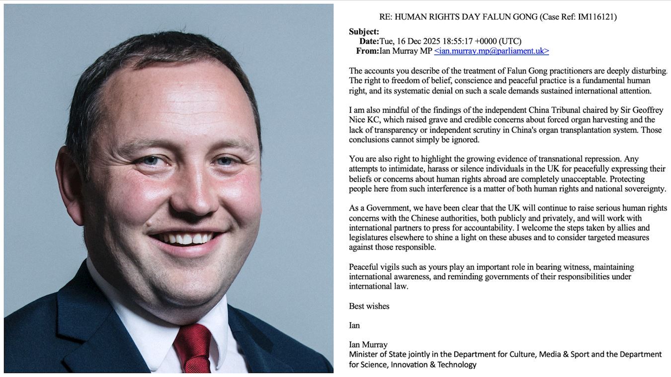 Britanski ministar, zastupnik Ian Murray, je izrazio zabrinutost zbog progona s kojim se suočavaju praktikanti Falun Gonga. On je izjavio: „Opisi načina na koji se tretiraju Falun Gong praktikanti koje ste iznijeli su duboko uznemirujući. Pravo na slobodu vjerovanja, savjesti i mirnog prakticiranja je temeljno ljudsko pravo, a njegovo sistematsko uskraćivanje u ovim razmjerima zahtijeva stalnu međunarodnu pažnju.