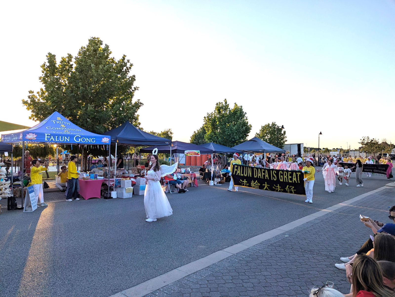 Praktikanti su imali štand i na Božićnom festivalu u Ellenbrooku, Perth, održanoj u subotu, 13. decembra 2025. godine. Prolaznicima su predstavili fizičke i mentalne dobrobiti koje donosi prakticiranje Falun Dafa i demonstrirali vježbe. Kasnije te večeri su učestvovali u paradi i proslavili praznika s mještanima.