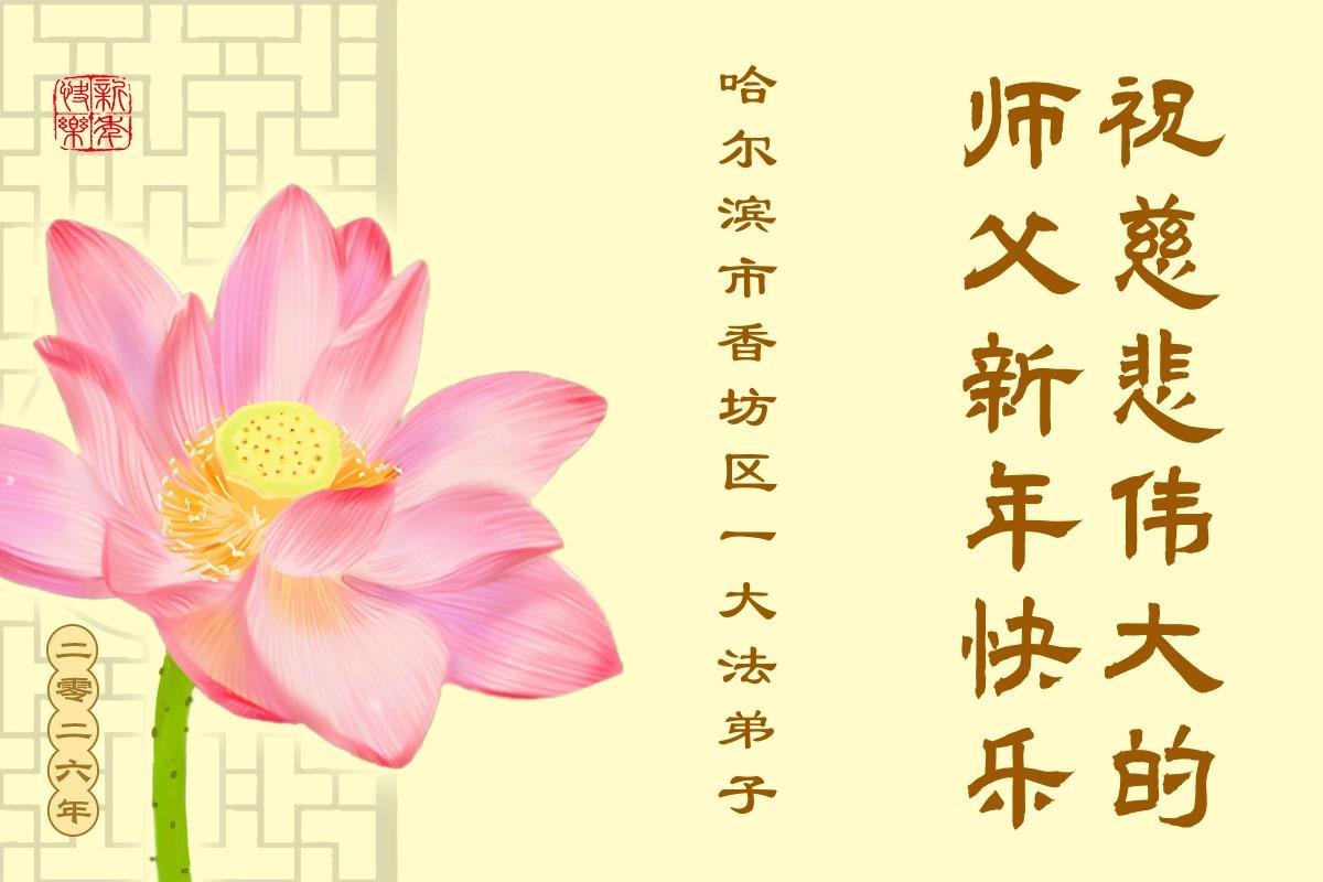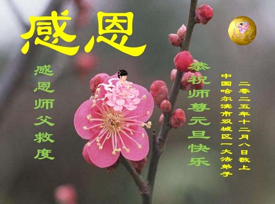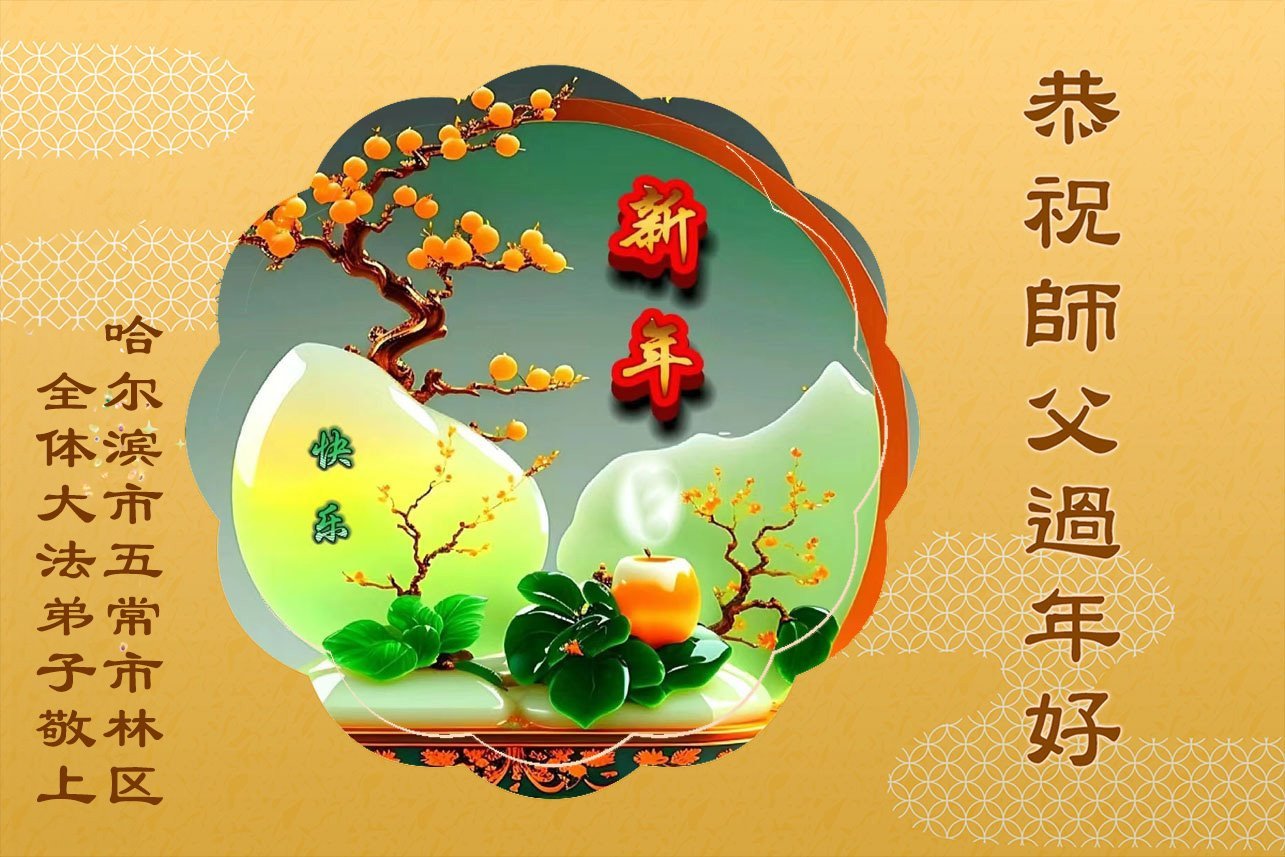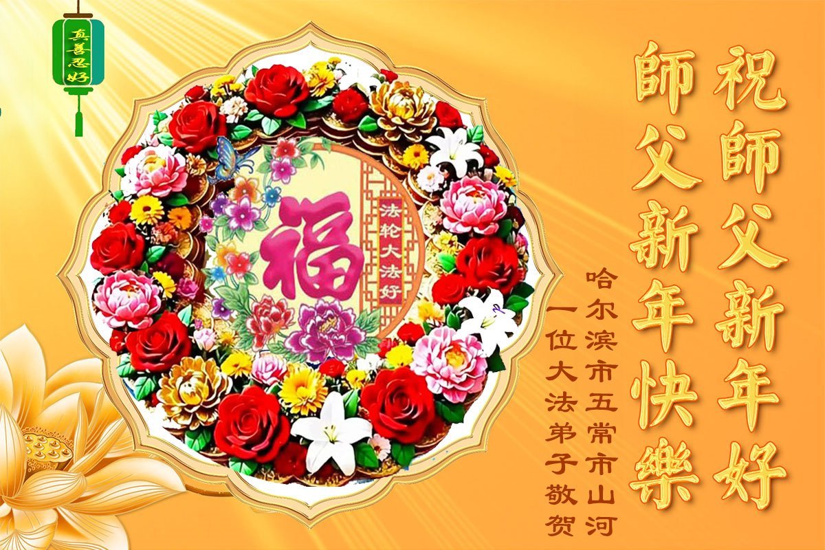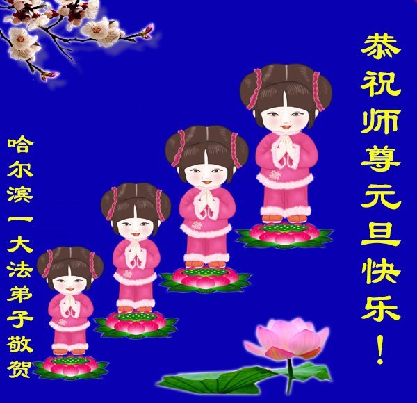 Falun Dafa praktikanti iz grada Harbina s poštovanjem žele Učitelju Li Hongdžiju srećnu Novu godinu (108 čestitki)