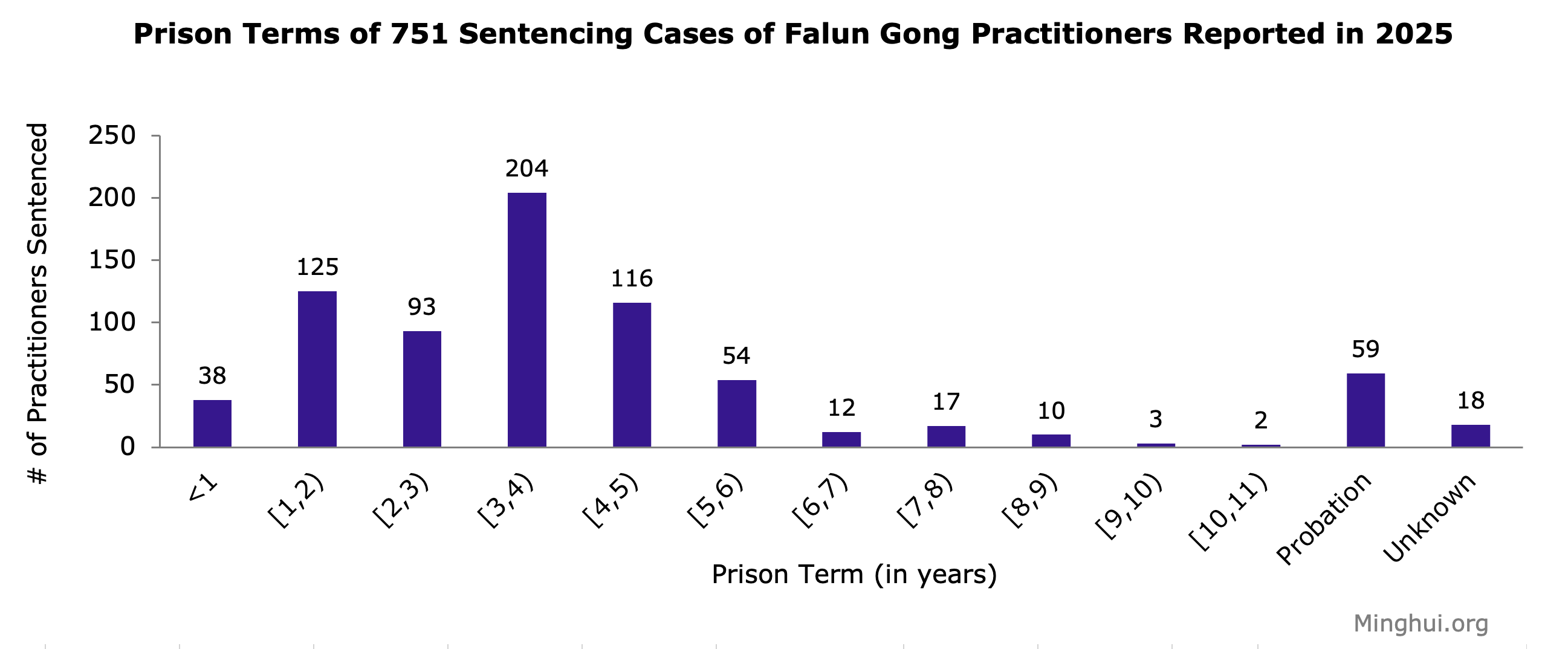 Kinesko Vrhovno narodno tužilaštvo je objavilo u februaru 2024. godine da je posljednjih godina 85% osuđenih kriminalaca dobilo tri godine ili manje, u poređenju sa 55% u 1999. godini. Ipak, za 751 slučaj presuda Falun Gong praktikanata prijavljenih 2025. godine, 418 njih (55,7%) je osuđeno na tri do deset godina, što ukazuje na strožije presuđivanje Falun Gong praktikantima, iako nisu prekršili nijedan zakon u ostvarivanju svog ustavnog prava na slobodu vjerovanja.