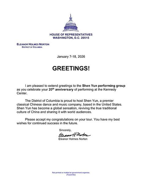 Zastupnica Eleanor Holmes Norton poslala je čestitke Shen Yun Performing Arts na početku turneje, povodom 20. obljetnice, predstavama u Kennedy Centru od 7. do 18. siječnja 2026.