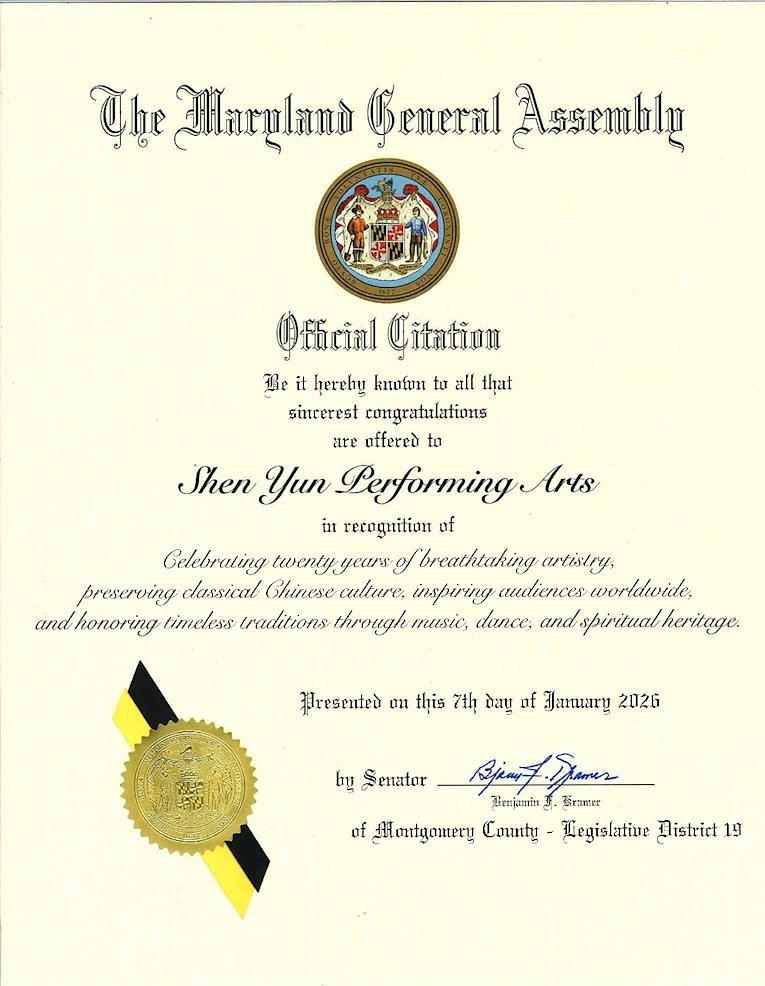 Dana 7. siječnja 2026., Benjamin Kramer, senator u Generalnoj skupštini Marylanda, izdao je službeno priznanje čestitajući Shen Yun Performing Arts.