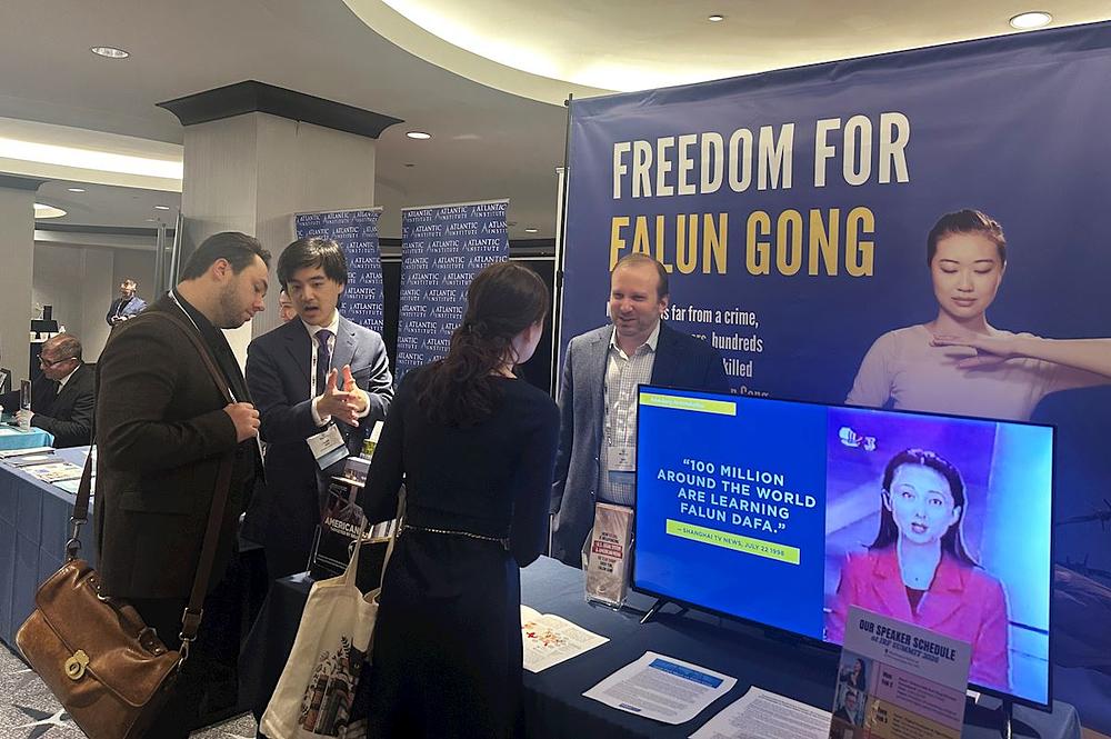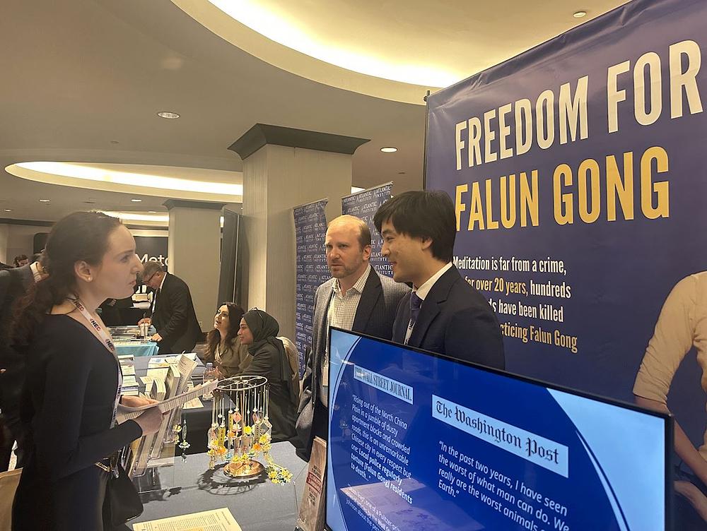 Praktikanti su postavili štand u hotelu Hilton i puštali video materijale kako bi predstavili Falun Dafu (Falun Gong) i objasnili ljudima zašto Komunistička partija Kine (KPK) brutalno progoni ovu praksu poslednjih 26 godina. Mnogi učesnici konferencije su zastali da saznaju više o ovom problemu. Neki su rekli da nisu znali za progon KPK i da cene što su praktikanti podigli svest o progonu na samitu.