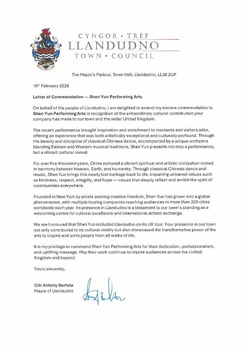 Dva dana kasnije, napisao je pismo organizaciji domaćinu u znak zahvalnosti za veliki doprinos predstave. „Više od pet hiljada godina, Kina je negovala živu duhovnu i umetničku civilizaciju utemeljenu u harmoniji između Neba, Zemlje i čovečanstva. Kroz klasični kineski ples i muziku, Shen Yun vraća ovo gotovo izgubljeno nasleđe u život, prenoseći univerzalne vrednosti kao što su ljubaznost, poštovanje, integritet i nada – vrednosti koje duboko odražavaju i obogaćuju duh zajednica svuda“, napisao je gradonačelnik Bertola.