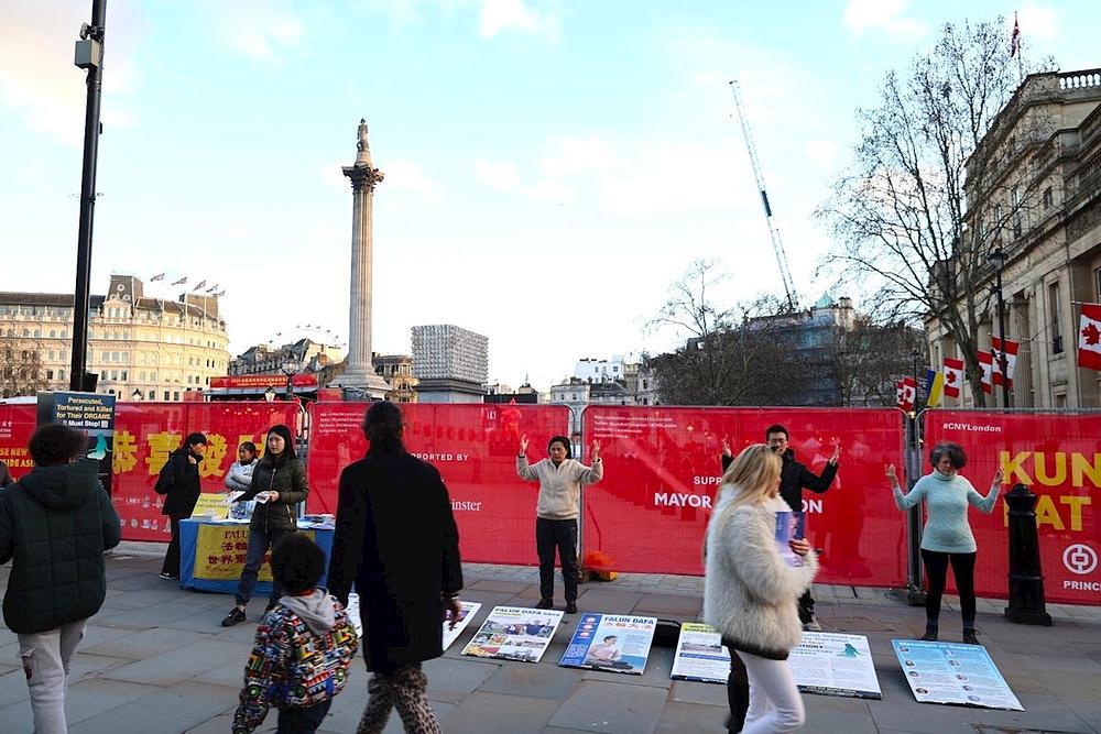 Tog su dana na Trafalgar Squareu postavili pozornicu te su se izvodili pjesme, plesovi i drame. U kineskoj četvrti, koja je tri minute hoda udaljena od Trga, održana je parada. Raznobojni ukrasi, lampioni te ples lavova i kineskih zmajeva u kineskoj četvrti privukli su brojne turiste. Na sjevernoj strani Trafalgar Squarea, jedne od najpoznatijih britanskih turističkih znamenitosti, nasuprot Nacionalne galerije, nalazio se stol praktikanata. Mnogi ljudi su se zaustavili kod stola praktikanata. Saznali su da se praksa podučava u više od 100 zemalja i područja te su čuli o 26-godišnjem progonu u Kini. Mnogi su potpisali peticiju kojom se KPK poziva na prekid progona i ohrabrili su praktikante da nastave razotkrivati zločine Partije.