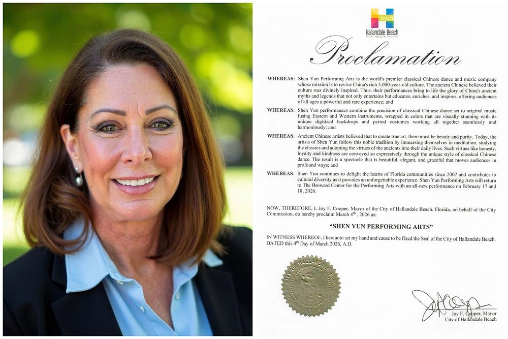 Gradonačelnica Joy F. Cooper iz Hallandale Beacha uručila je proglas Shen Yun Performing Arts-u u gradskoj vijećnici navečer 4. ožujka 2026., proglašavajući taj dan: „Shen Yun Performing Arts”.