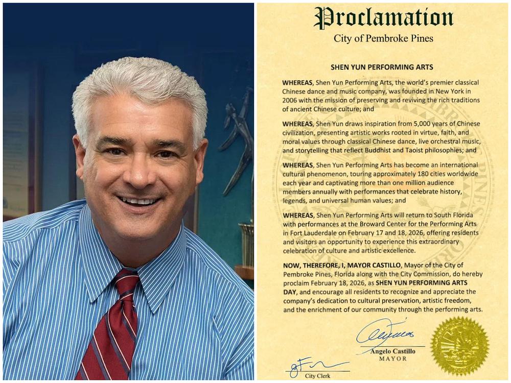 Gradonačelnik Angelo Castillo iz Pembroke Pinesa izdao je proglas Shen Yun Performing Arts-u u gradskoj vijećnici poslijepodne 18. veljače 2026.