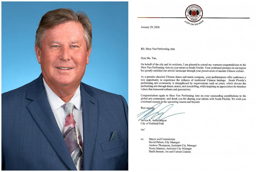 Gradonačelnik Steven R. Arnst iz Oakland Parka poslao je pismo organizaciji koja je domaćin Shen Yun Performing Arts-u na južnoj Floridi 29. siječnja 2029.