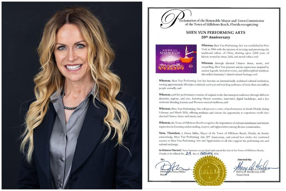 „Stoga, ja, Dawn Miller, gradonačelnica grada Hillsboro Beacha, Florida, ovime priznajem 20. obljetnicu Shen Yun Performing Arts-a, i upućujem najbolje želje za kontinuirani uspjeh Shen Yun Performing Arts-u te zahvalnost svima koji podržavaju izvođačke umjetnosti i kulturnu razmjenu.”